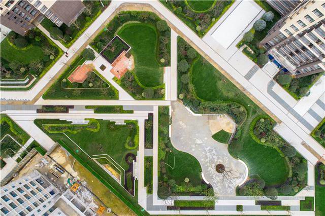 在翡翠公園的陽(yáng)臺(tái),你看見(jiàn)的景色還可以更多。你還可以像工地開(kāi)放日來(lái)參觀的業(yè)主們一樣,站在自家寬敞的陽(yáng)臺(tái)上,扶著欄桿,俯忘樓下小區(qū)綠地蟠青叢翠。在這次開(kāi)放日活動(dòng)中,翡翠公園綠化獲得業(yè)主贊譽(yù)無(wú)數(shù)。前文提到的建設(shè)完整是獲贊的原因之一,另外一個(gè),則是匠心設(shè)計(jì)下,環(huán)境與建筑風(fēng)騷各領(lǐng),呈現(xiàn)出極具藝術(shù)性的融契之美。項(xiàng)目以陶淵明筆下《桃花源記》為居住藍(lán)本,布局“一環(huán)兩軸五重境”之景,打造了城市里的心棲之地。其中,即將交付樓棟所在的一地塊綠地率約41.29%,總面積近乎有四個(gè)足球場(chǎng)那么大。站在樓上向中庭園林望去,整體規(guī)劃設(shè)置錯(cuò)落有致,各區(qū)域間三角形幾何劃分,幾何美學(xué)的理智之美,躍然眼前,不自然就讓你聯(lián)想到法式園林,如凡爾賽宮園林對(duì)工整幾何圖形的極致追求。
