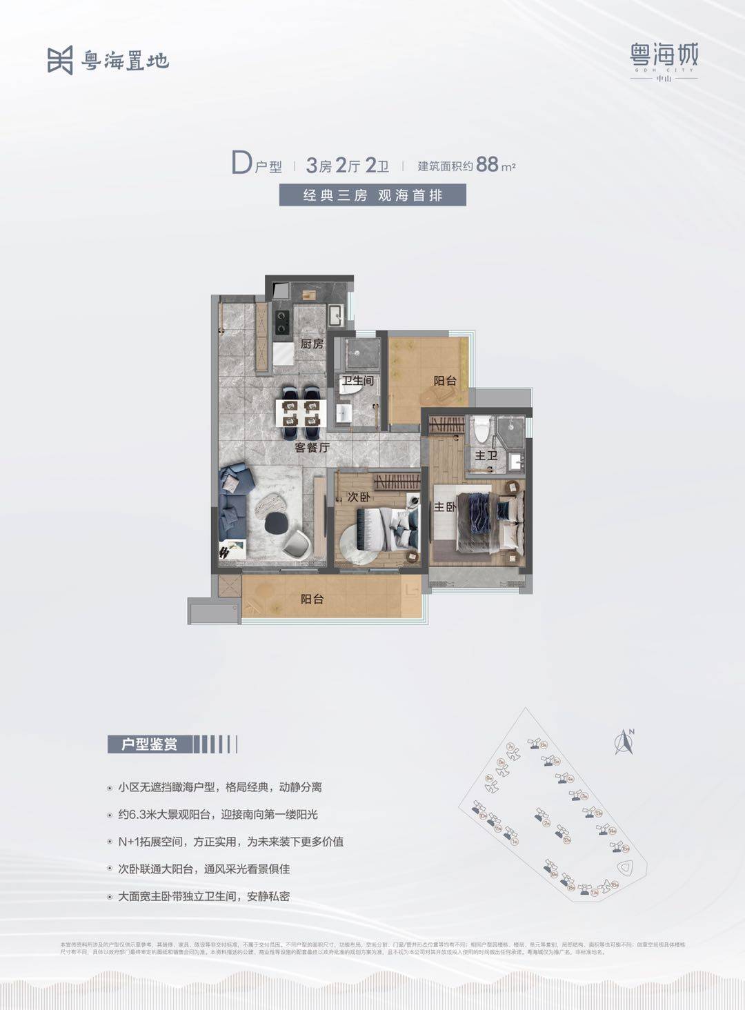 D戶(hù)型:建面約88m² 3房2廳2衛(wèi)