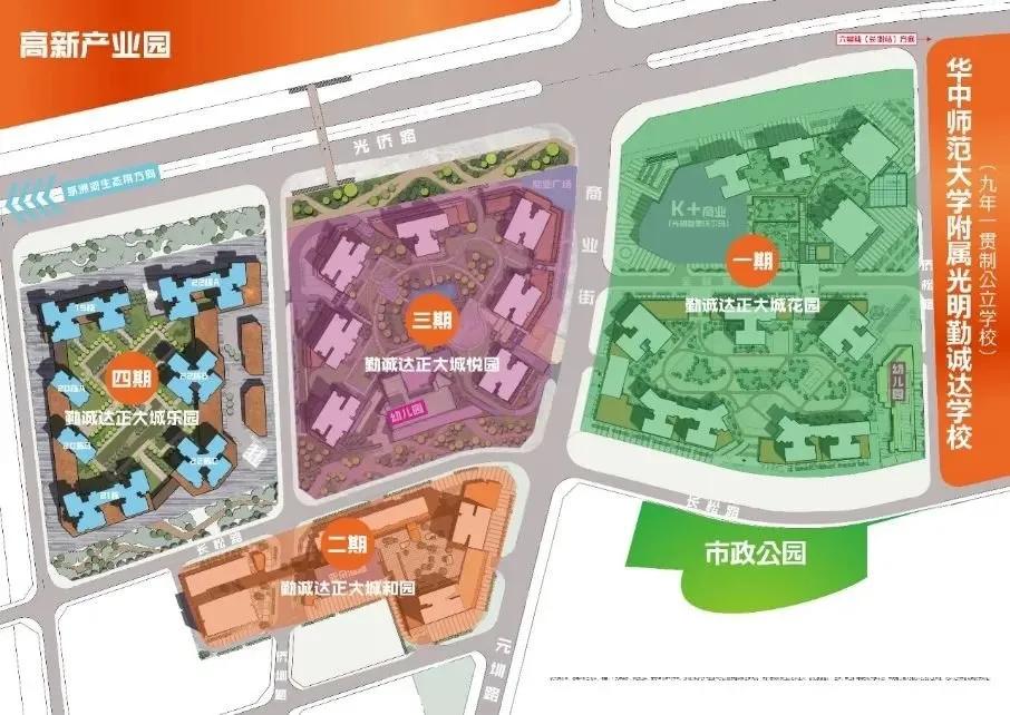 勤誠達正大城配建了2所12班的公立幼兒園,和9年一貫制公立學校—華中師范大學附屬光明勤誠達學校,學校與勤誠達正大城一期僅一路之隔。