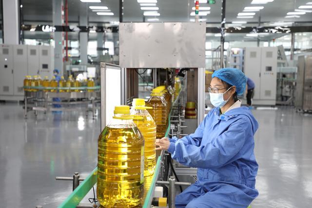 圖為海南澳斯卡國際糧油有限公司智能化包裝車間,工作人員對包裝油進行質(zhì)量檢查。(黎多江 攝)