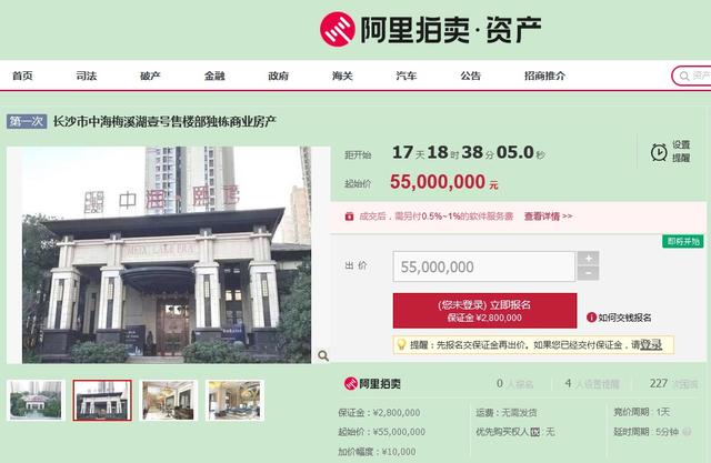 阿里拍賣網(wǎng)信息顯示,11月28日,中海梅溪湖壹號售樓部獨(dú)棟商業(yè)房產(chǎn)將迎來競拍,起拍價(jià)為5500萬元。競買公告稱,長沙凱樂信息技術(shù)有限公司為委托人,對中海梅溪湖壹號售樓部進(jìn)行公開競價(jià)。