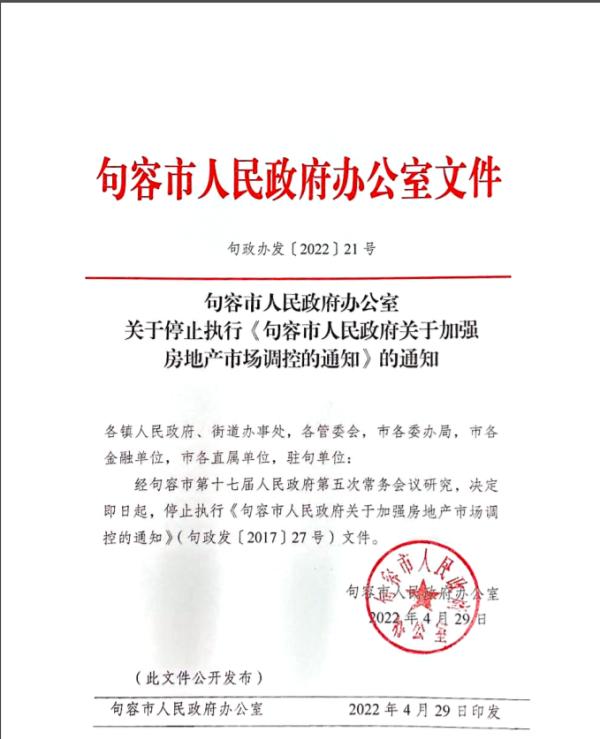 句容市住建局相關(guān)人士告訴澎湃新聞,5月4日,市相關(guān)部門組織召開房地產(chǎn)良性發(fā)展和健康發(fā)展座談會(huì),部分房地產(chǎn)開發(fā)企業(yè)、中介機(jī)構(gòu)負(fù)責(zé)人與會(huì)。座談會(huì)宣布,停止執(zhí)行《關(guān)于加強(qiáng)房地產(chǎn)市場(chǎng)調(diào)控的通知句政發(fā)〔2017〕27號(hào)》,全面取消外地戶籍限購(gòu);全面執(zhí)行4月29日開始的鎮(zhèn)江樓市新政。