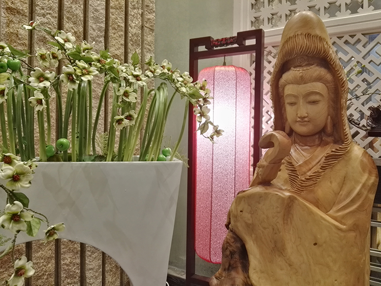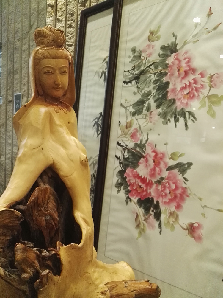 劉總向陳先生介紹寶億萊軟裝如何運用根雕藝術(shù)品