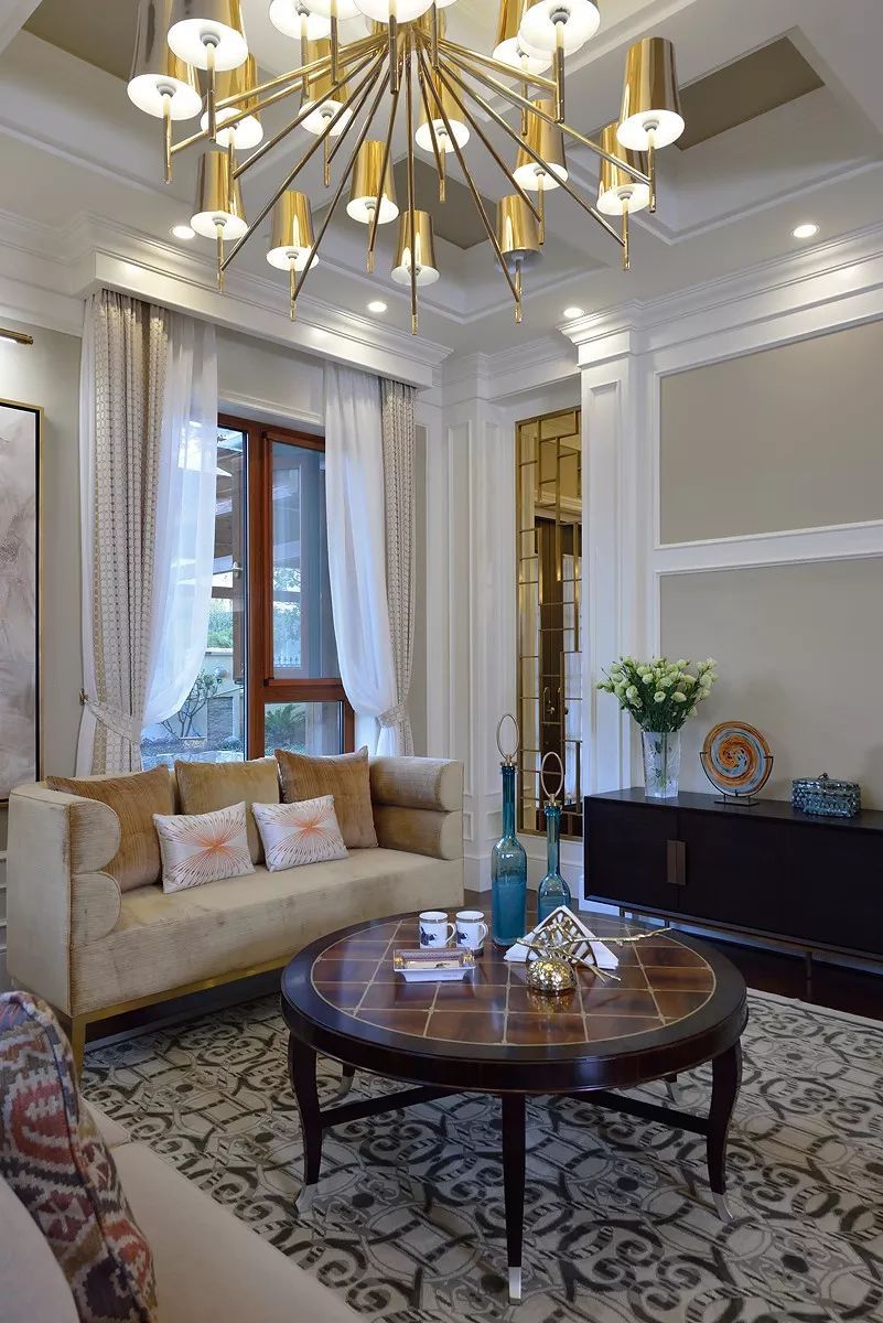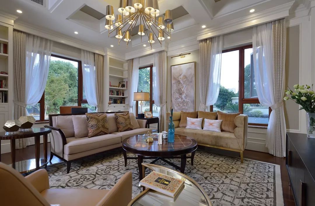 環(huán)形采光,優(yōu)越的挑高讓空間更顯雍容氣度。白色窗紗,米色窗簾,大氣溫馨,窗外遠(yuǎn)處翠色連綿,近處綠草如茵,一派貴族氣度,一腔柔情詩意。