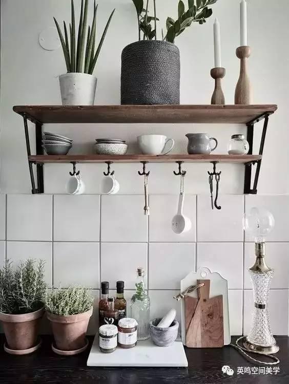 廚房的一角,廚具排放有序而精致。軟裝陳設要看視覺點,關注整個廚房的時候,人們不會把目光停留在太具體的點上。陣列式適合裝飾整體空間,是軟裝陳設中的常用手法。
