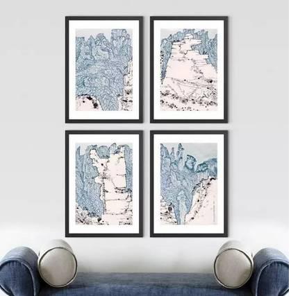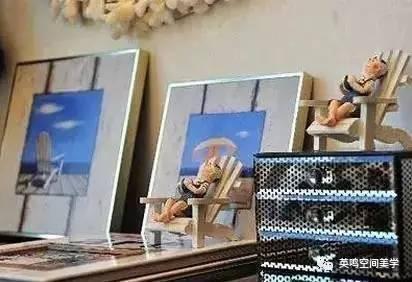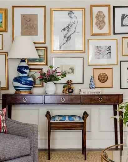 本案中的掛畫采用了大小不一、錯落有致的陳列手法,稱之為組合式陳列手法。其特點是布局豐富,由點到面組合合理。