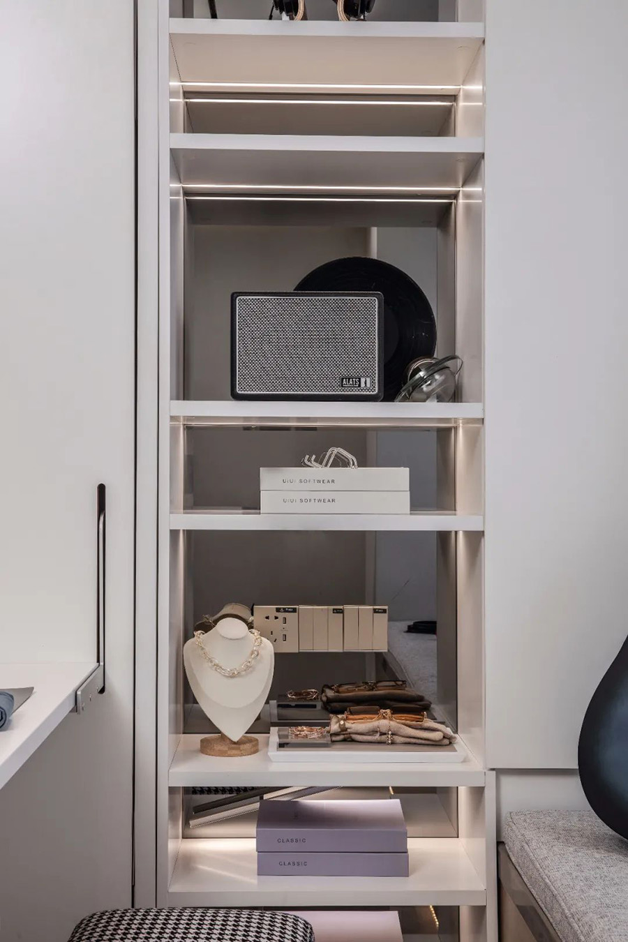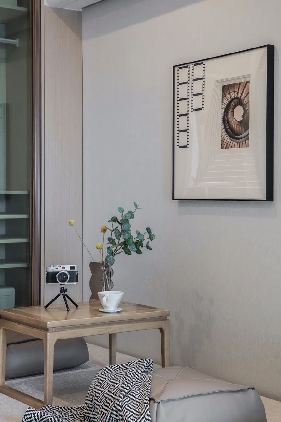 淺木書架上整齊排列的鏡頭,經(jīng)過精心裝裱的攝影作品,呈現(xiàn)出雅致空間的藝術(shù)氣息,這些看似不經(jīng)意的細節(jié),體現(xiàn)了設(shè)計者對都市人內(nèi)心的洞察力。