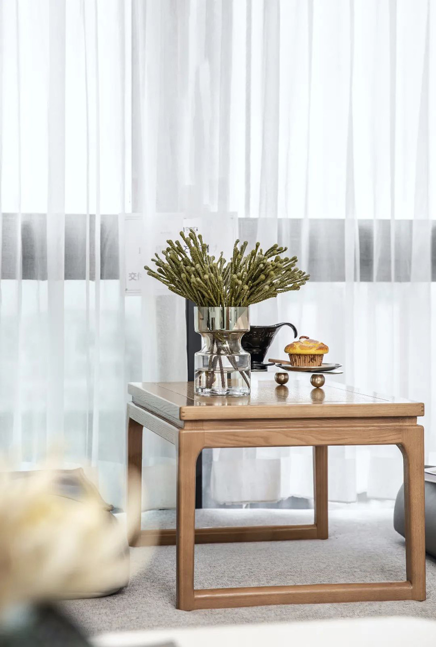 日式榻榻米臺面增加了空間的層次感,木色的小茶幾與深木色的玻璃衣櫥相互呼應(yīng),讓空間變得安靜,仿佛在喧囂的世界中有一方凈土。