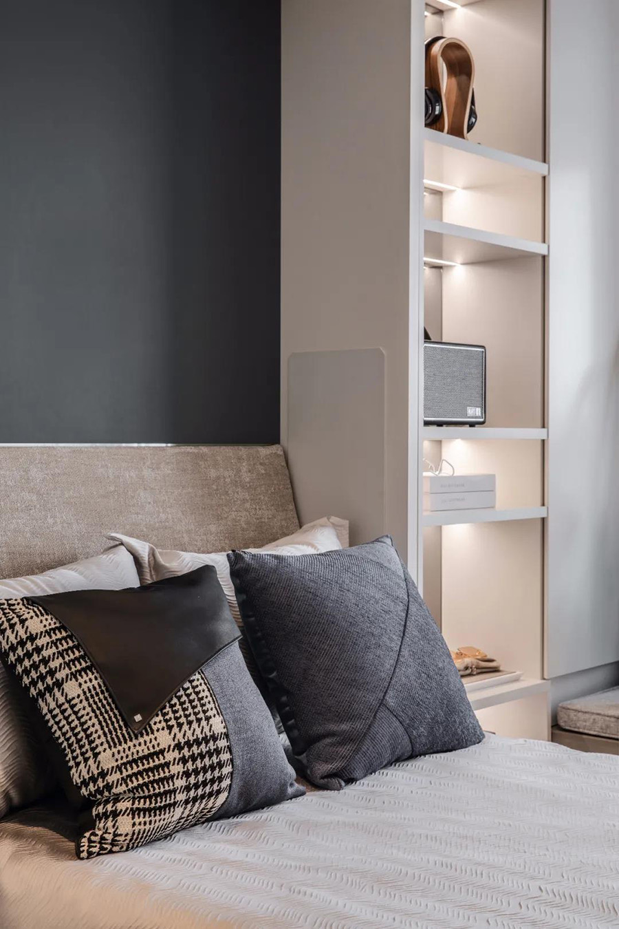 各種顏色明度的灰褐色,大面積的亞麻布上點綴著皮革,使這一小塊區(qū)域柔軟,具有城市摩登感。