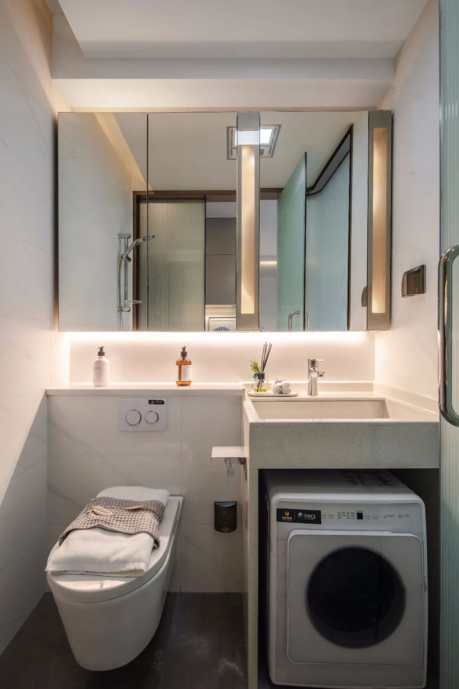 衛(wèi)浴間采用大理石和大面積鏡面材料,營造出通透的素雅質(zhì)感,嵌入燈帶的設(shè)計營造出溫暖的氣息。