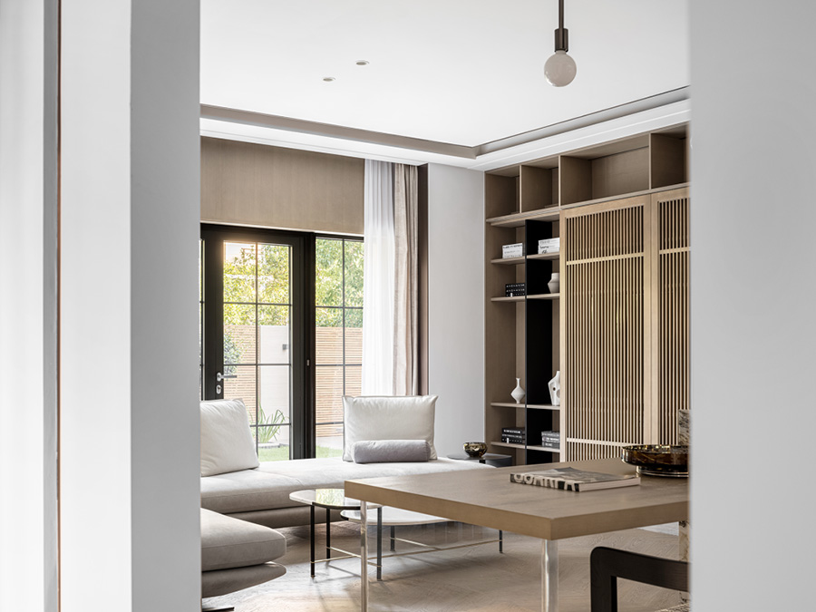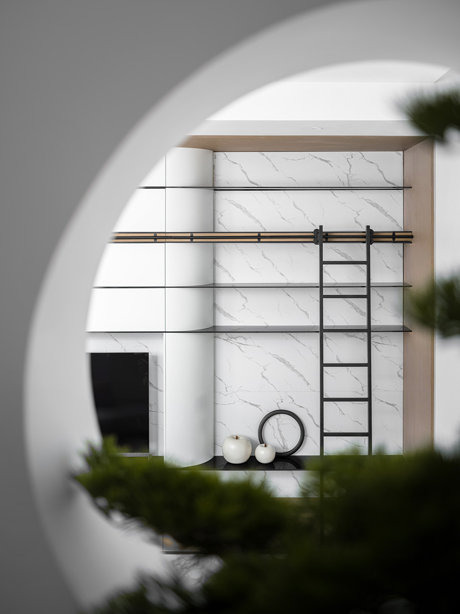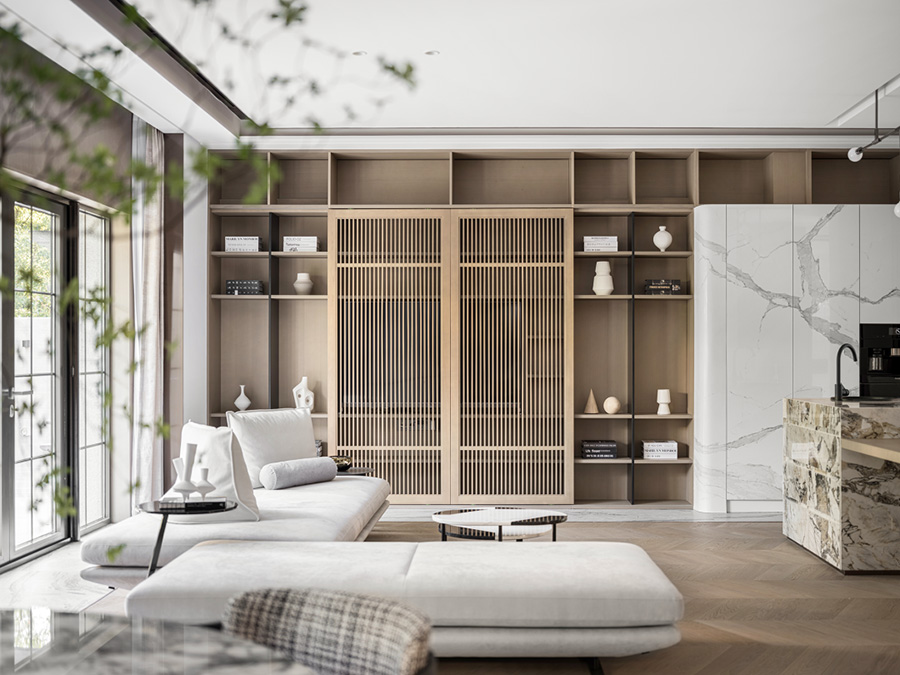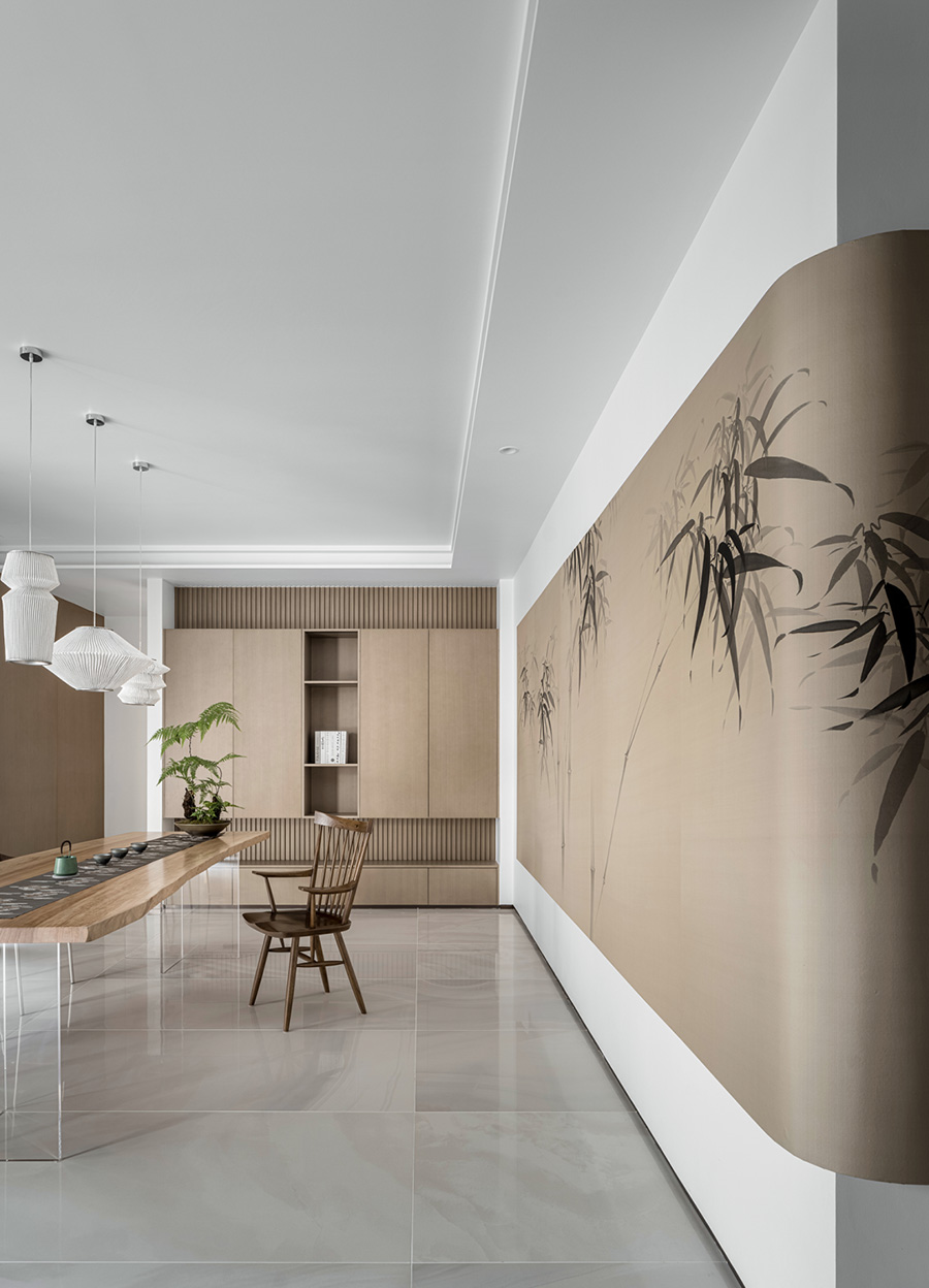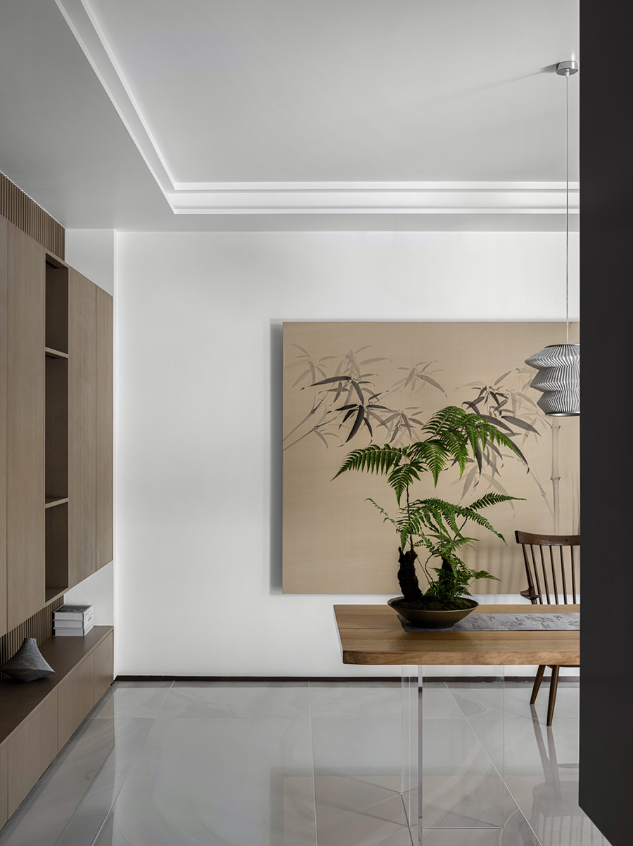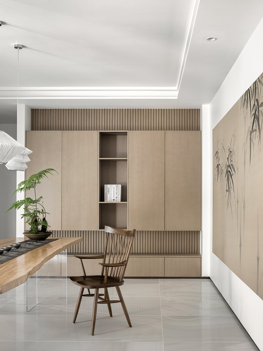 擋板門就是擋住了日常的電視,同時也創(chuàng)造了禪定的空間美學。設計者發(fā)掘生活的趣味性和居住意義,運用現(xiàn)代、文化、建筑語言,通過物質(zhì)和意識的雙重傳遞,創(chuàng)造出空間的藝術感、永恒感。