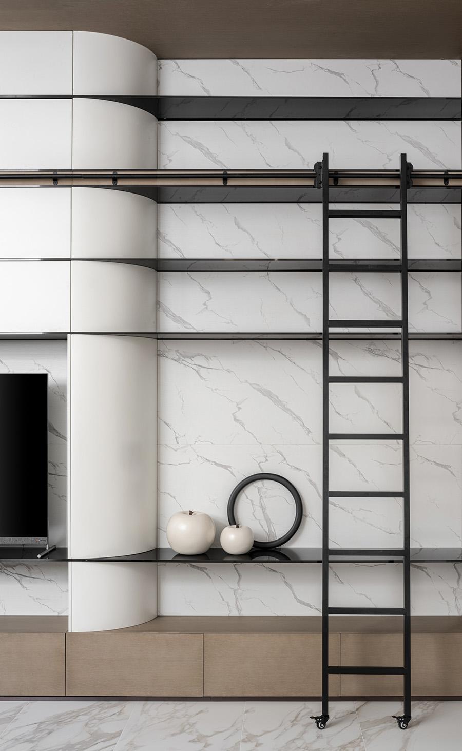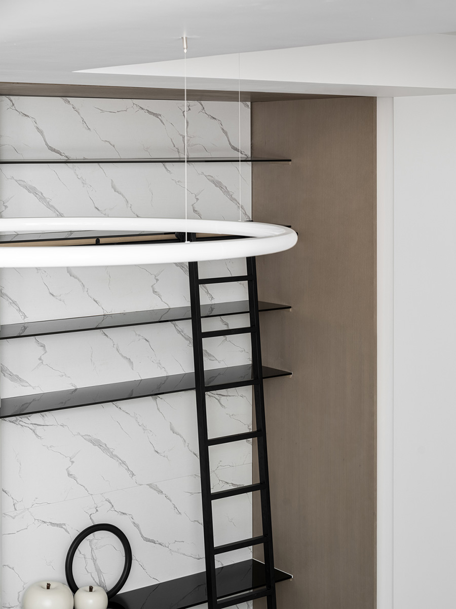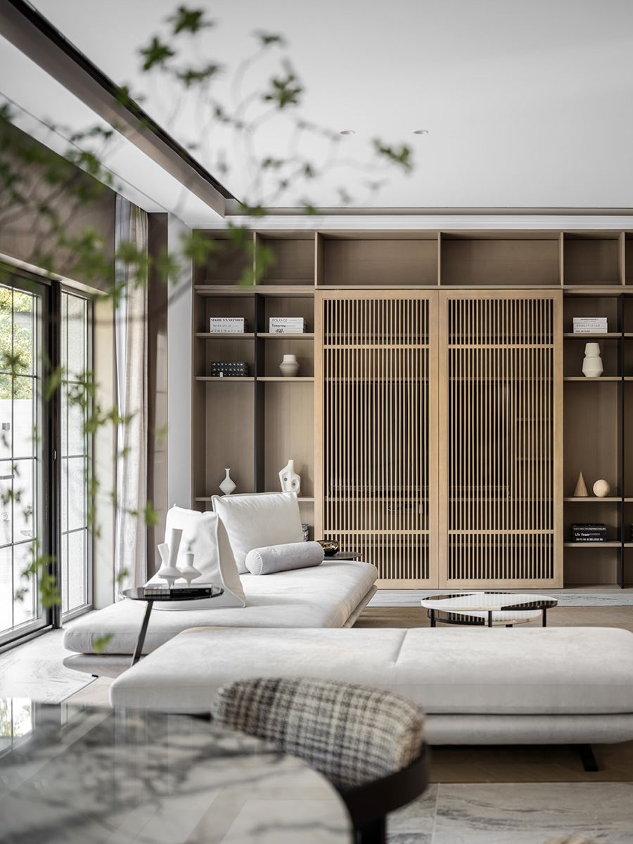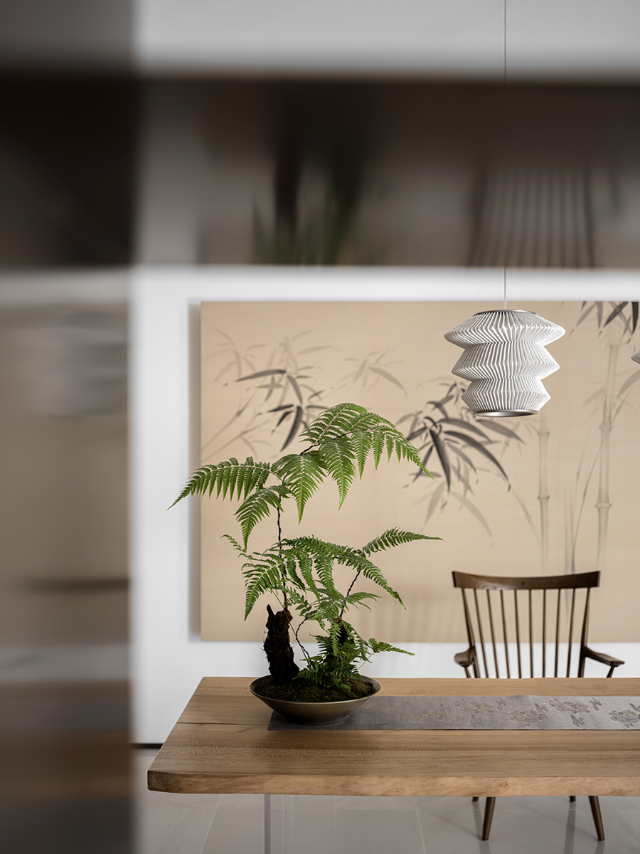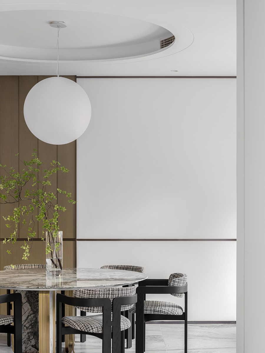 擋板門就是擋住了日常的電視,同時也創(chuàng)造了禪定的空間美學。設計者發(fā)掘生活的趣味性和居住意義,運用現(xiàn)代、文化、建筑語言,通過物質(zhì)和意識的雙重傳遞,創(chuàng)造出空間的藝術感、永恒感。