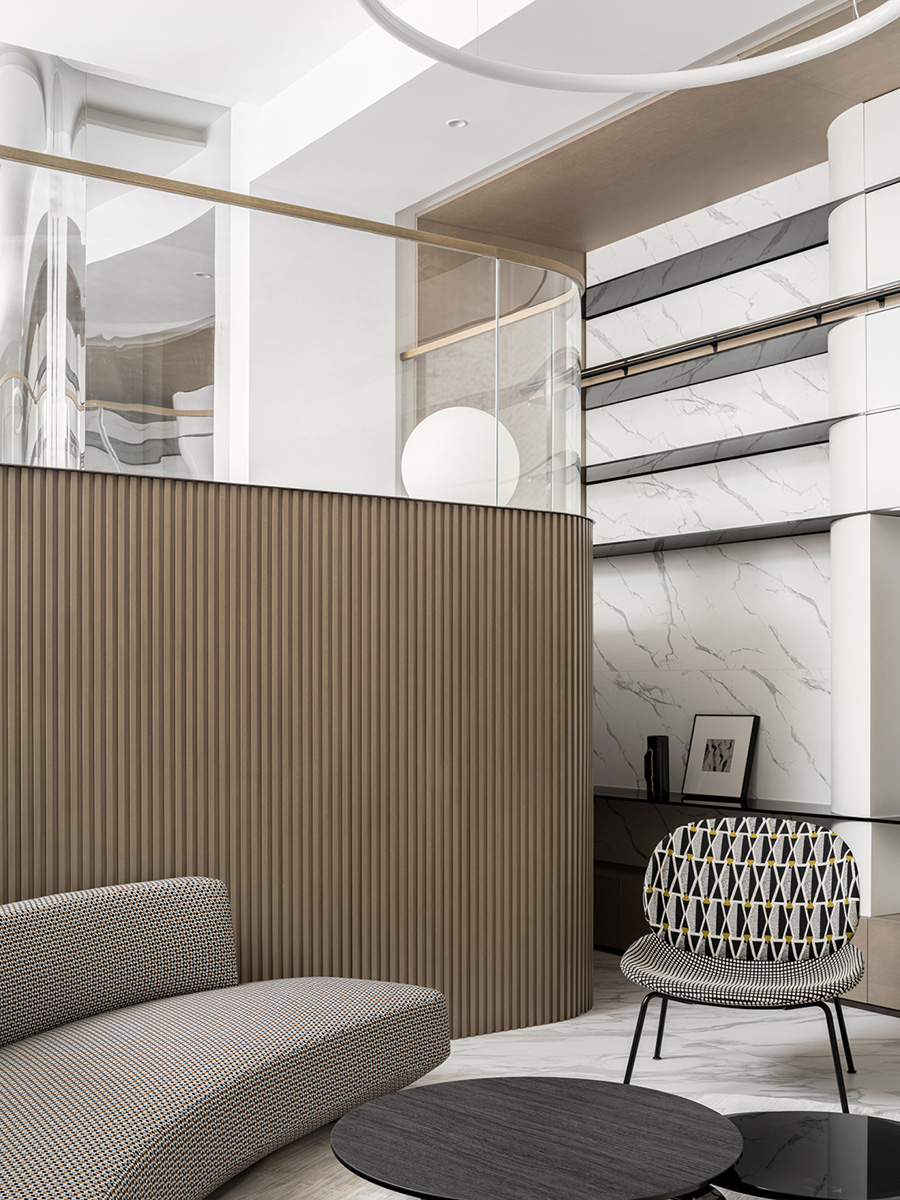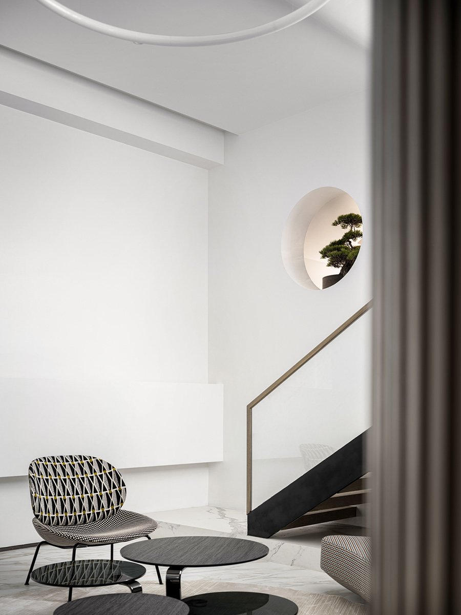 地下空間采用幾何構(gòu)造手法,將空間劃分成線和面的關系,大面積的留白使空間顯得簡潔明朗。三角形幾何形狀的面料面料再一次體現(xiàn)了設計師三角形和圓形、直線和曲線的設計語言和邏輯。