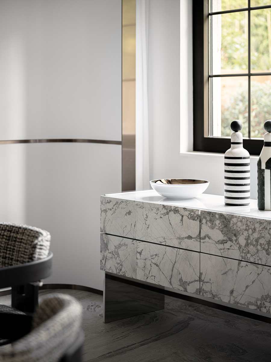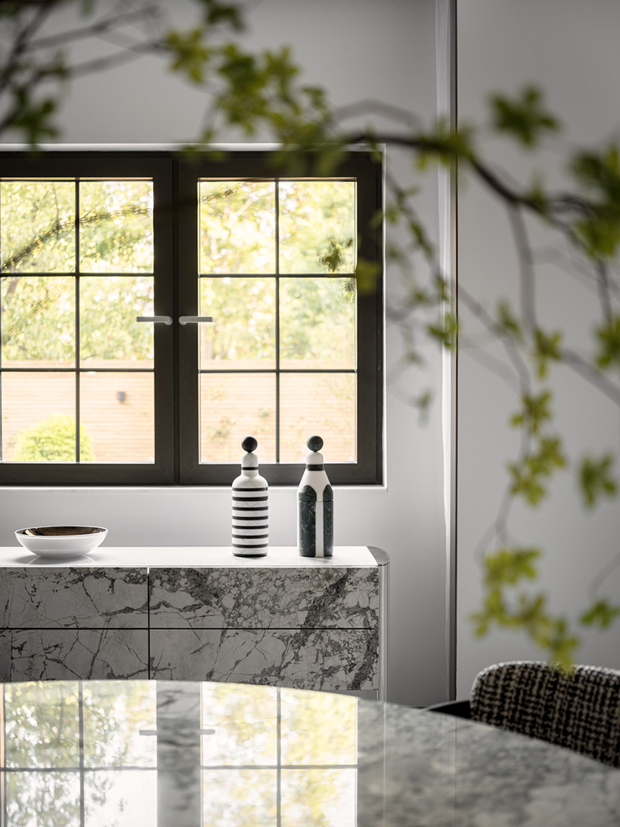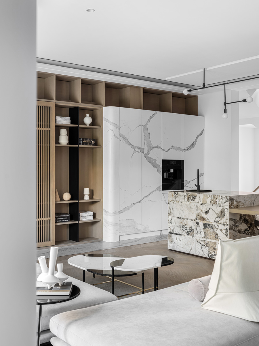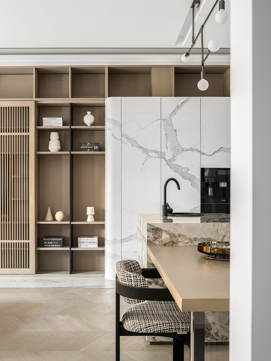 墨水紋理的石材櫥柜面與地面呼應,布料黑白相間,讓經(jīng)典的空間時尚而又充滿東方氣息。
