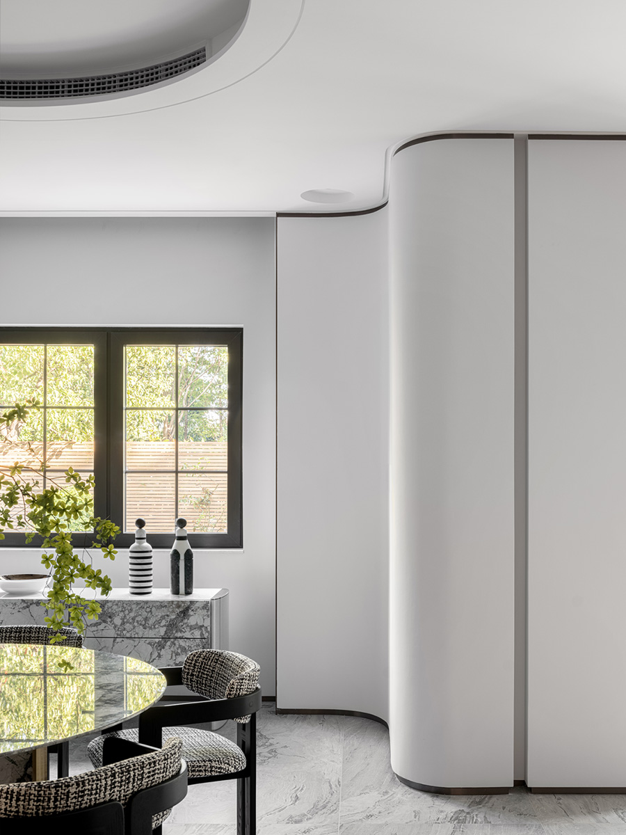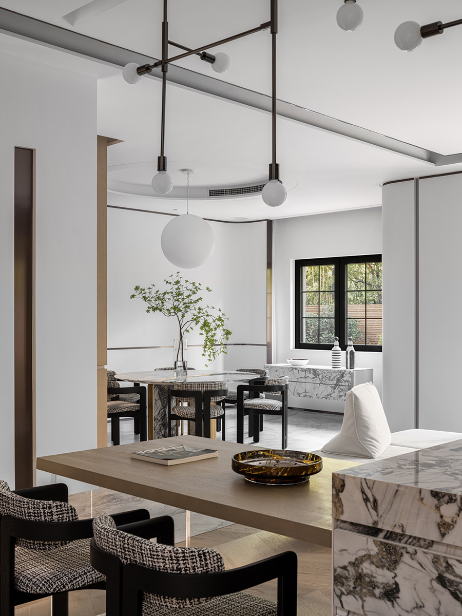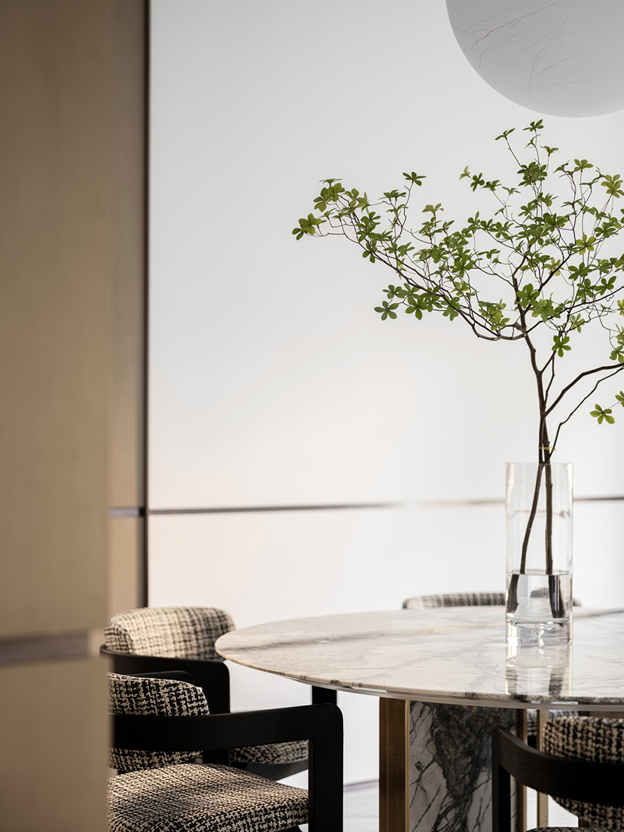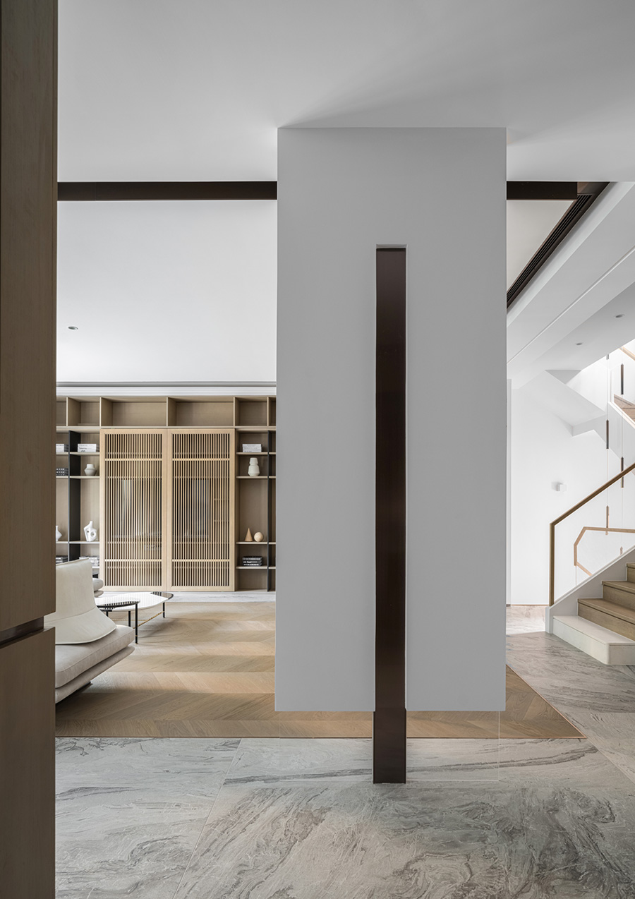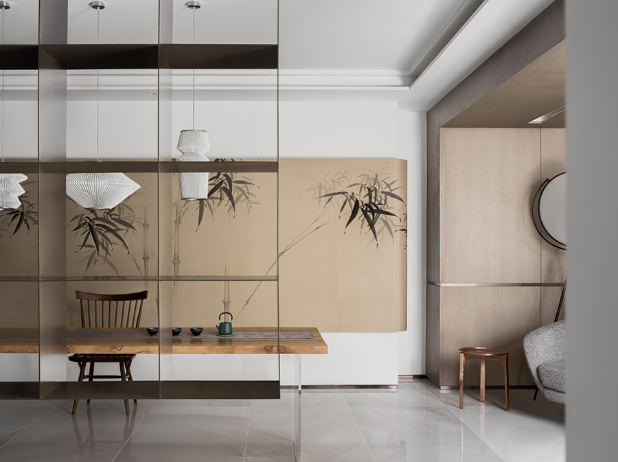 墻體流線的曲線和塊被分割,不同粗細的橫向和縱向,重新構(gòu)造出空間的塊面,讓留白空間更加有層次感。設計者透過材料與量體的呼應,溫潤的木制和古銅的金屬搭配,傳達著禪意的氣息,又不失精致格調(diào)。