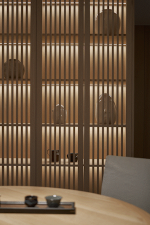 繞過島臺,眼睛里充滿了用餐區(qū)的優(yōu)雅與溫柔。柜簾條紋鏤空設(shè)計,搭配陶瓷飾品,盡顯琵琶半遮面的含蓄之美。推杯換盞之間,與我或知己朋友不言而喻,仿佛空間的寂靜,是一切完美的答案。