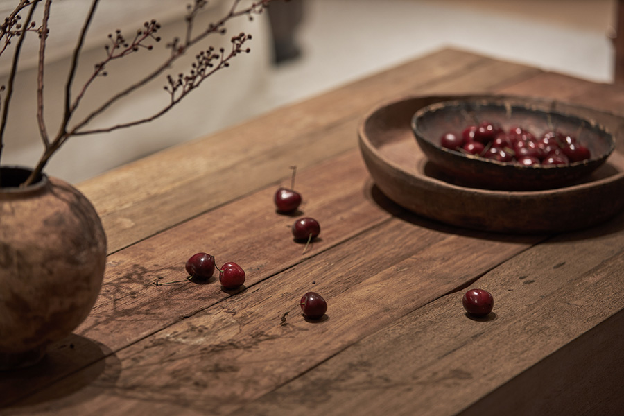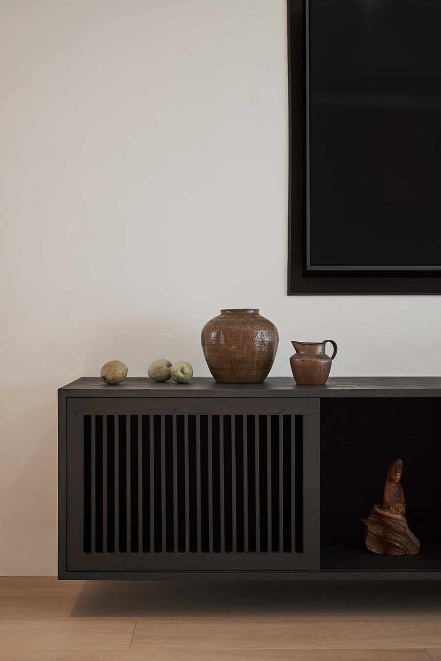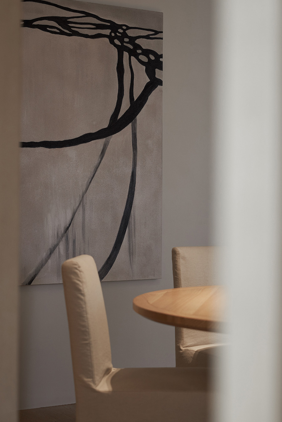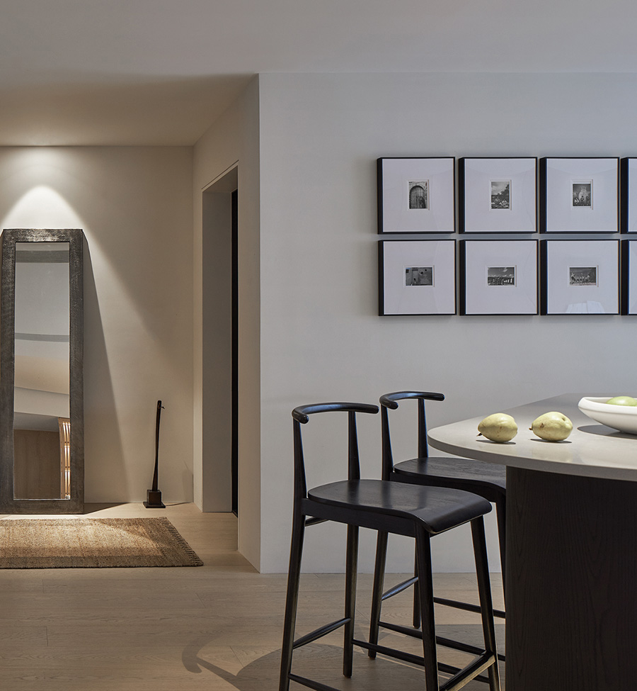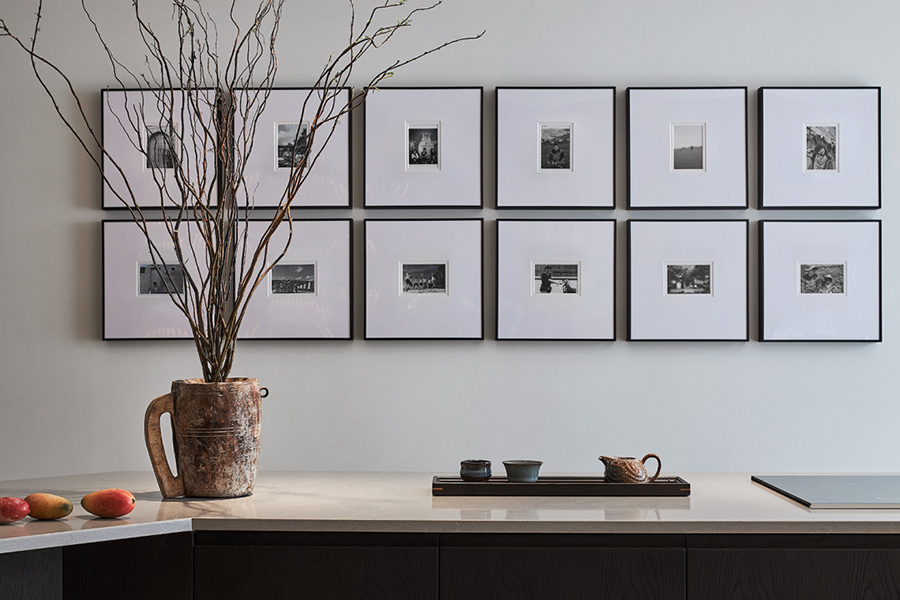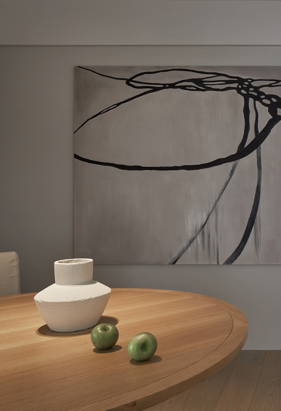 穿過玄關(guān),島臺映入眼簾。深黑色的裝飾有一抹寧靜的灰色。臺面上的裝飾擺件讓單調(diào)的灰色俏皮靈動,與墻面的留白墻掛相映成趣。島臺作為使用頻率較高的區(qū)域,設(shè)置在前后院動線之間。