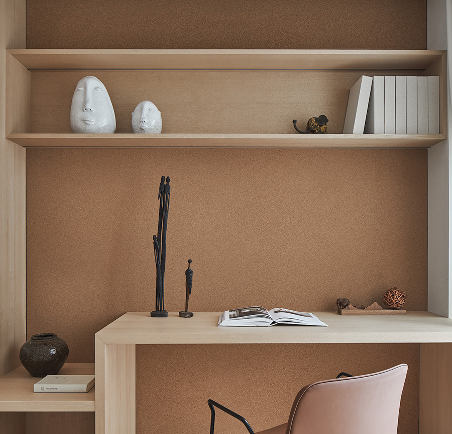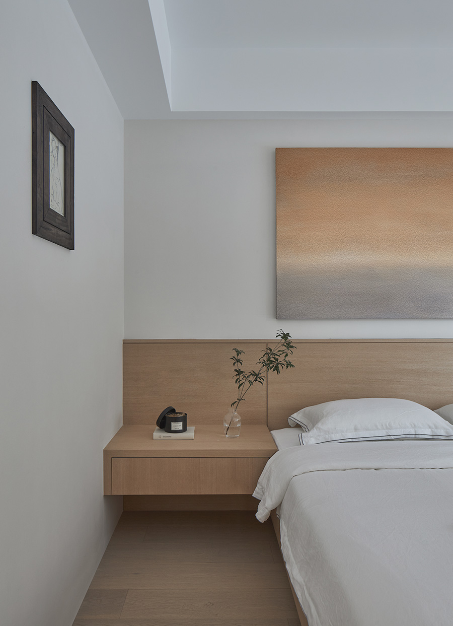 臥室作為具有休息功能的臥室,延續(xù)了客廳舒適營造的自然尷尬。床頭的漸變裝飾為空間增添了一抹亮色。而且它與臥室配色的融合與對應(yīng),更加禪意。仿佛在這里品茶的不再是茶,而是靜靜地沿著喉腔滋潤身心的時光。就像生活本身一樣,從不在別處,也不需要刻意向外尋求,在這個世界之間。