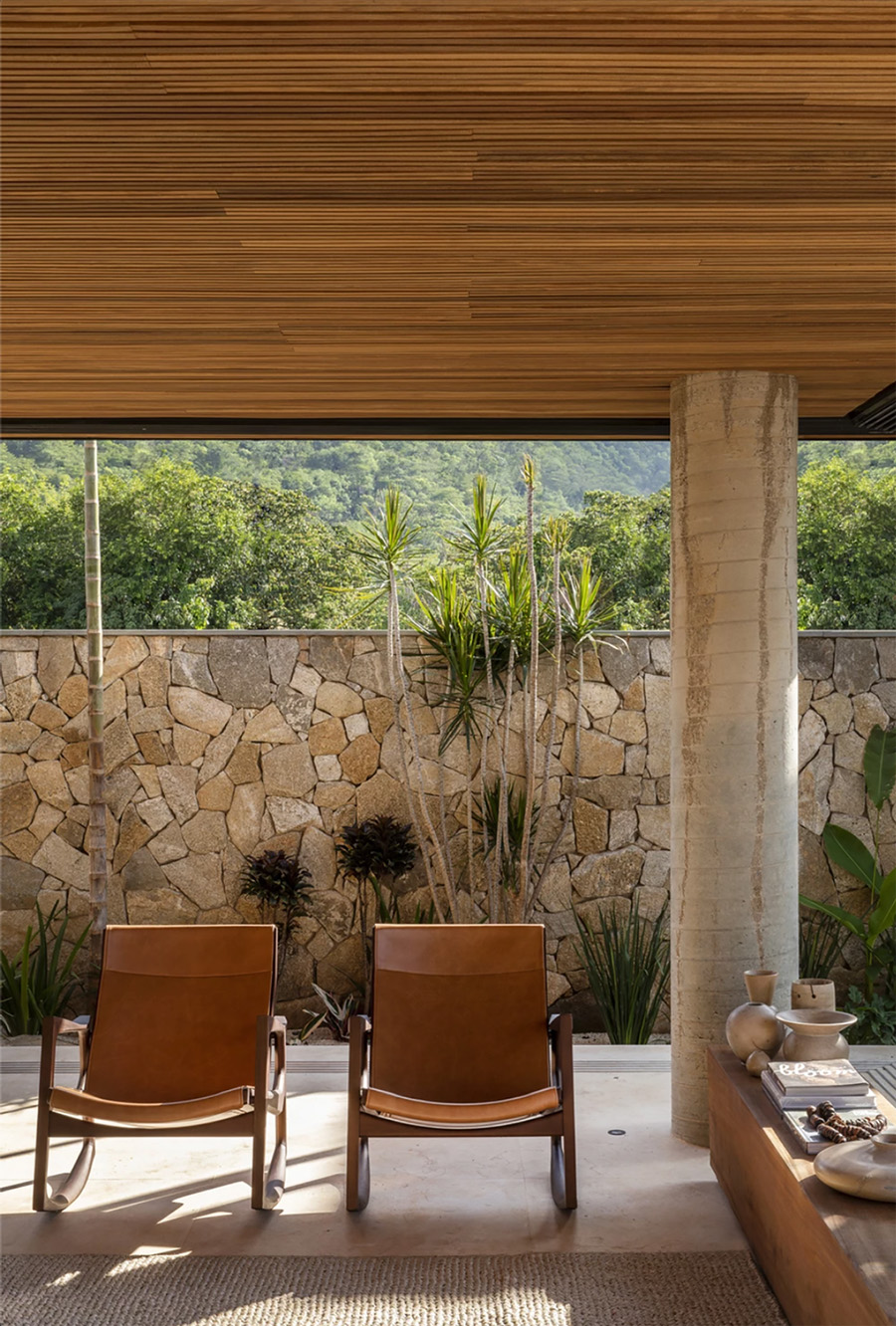 遠眺群山,心情舒暢,住在這里就像來到世外桃源。整座建筑就像一座植根于山頂?shù)淖匀唤ㄖ?,面對著山脊敞開的平臺,錯落有致的石墻,野蠻生長的自然景觀,共同營造出一種極簡靈動的靜謐建筑。