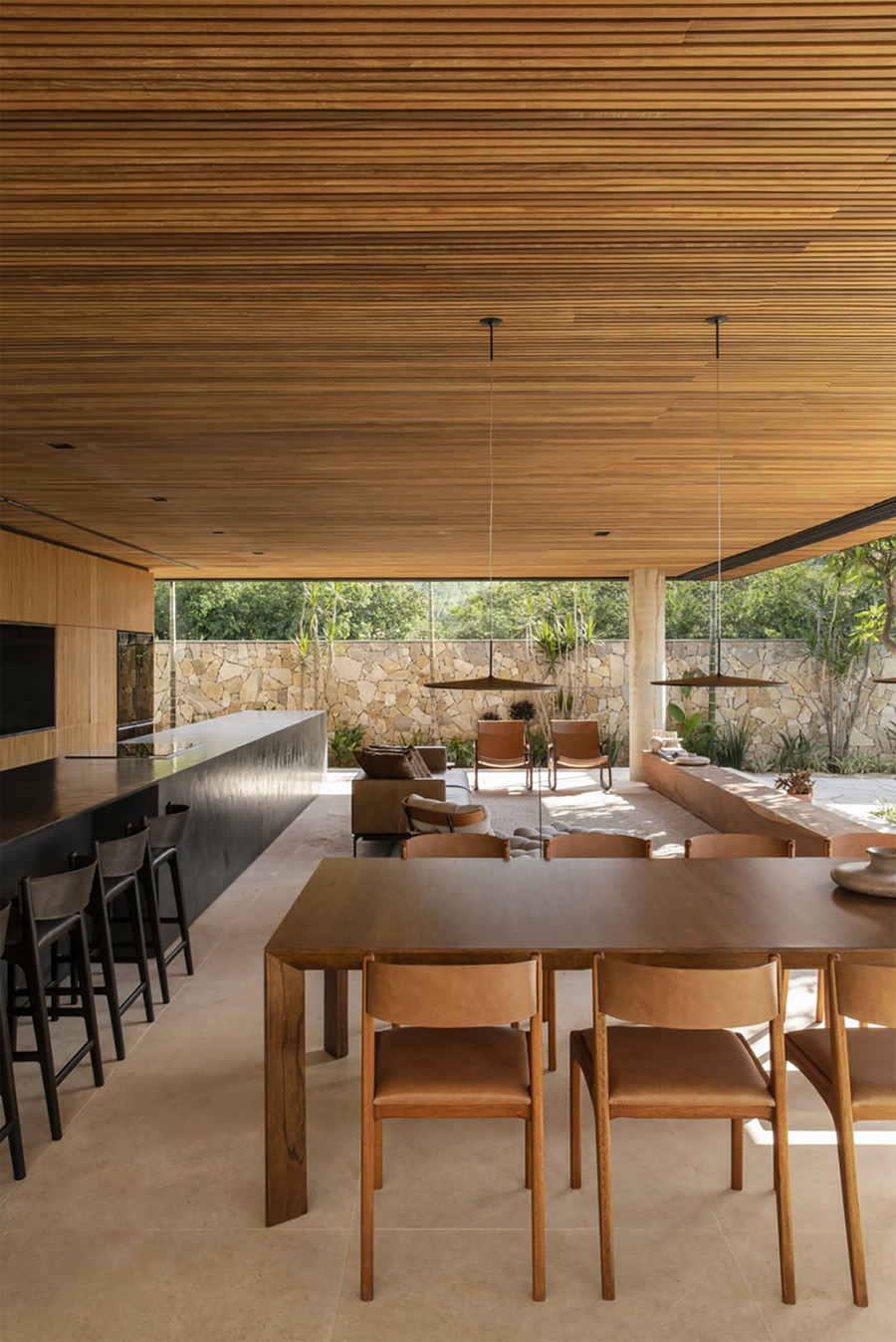 起居室、餐廳為自然三面開放狀態(tài),陽光、庭院、樹木、光影、風、云、雨、水等自然元素與建筑無縫連接,營造一種輕松、自然、愜意的度假氛圍,適合放空、發(fā)呆、閱讀,與家人、朋友在此分享生活之樂趣。