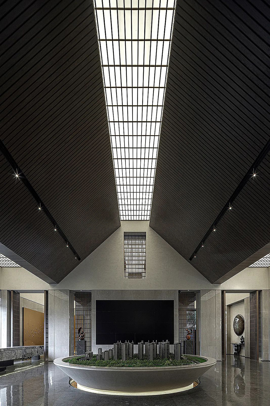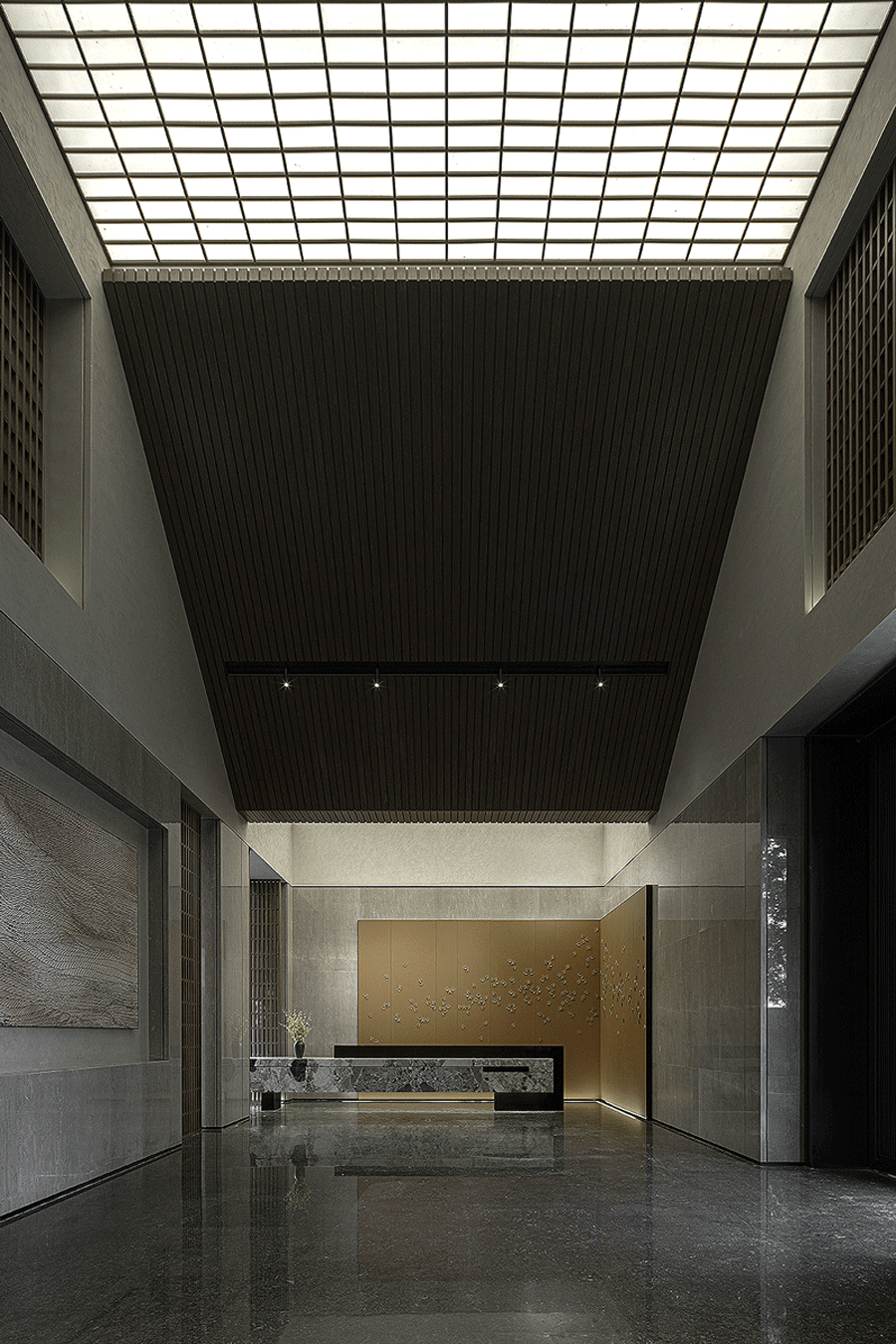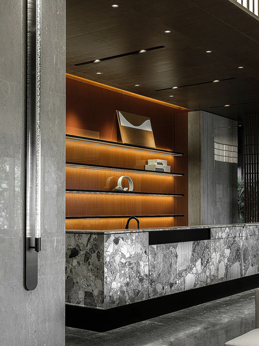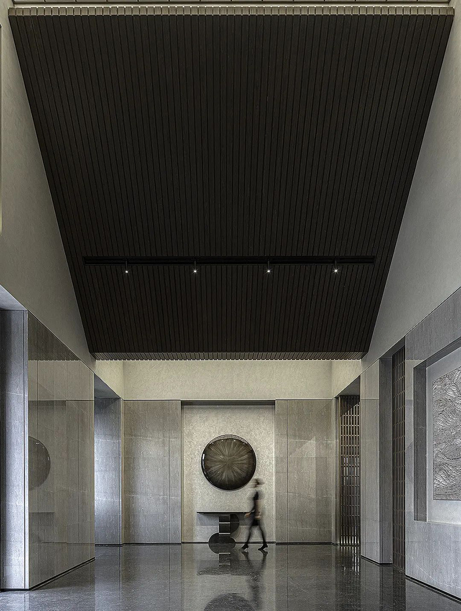 走進(jìn)前廳,一段回溯的旅程就此開始。來襲的斜坡孕育著莊重莊重的氣勢,強化了空間的縱深和體感,顯示出東方秩序的力量。