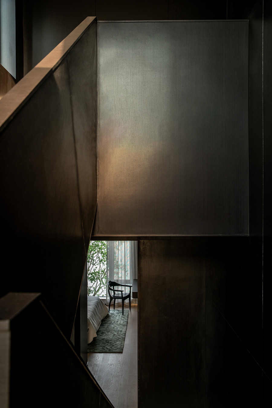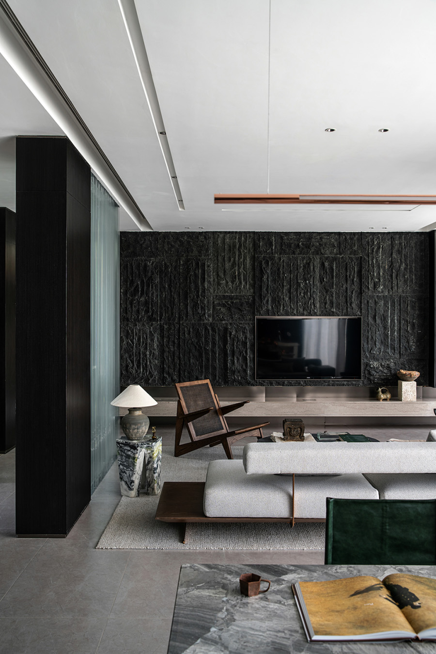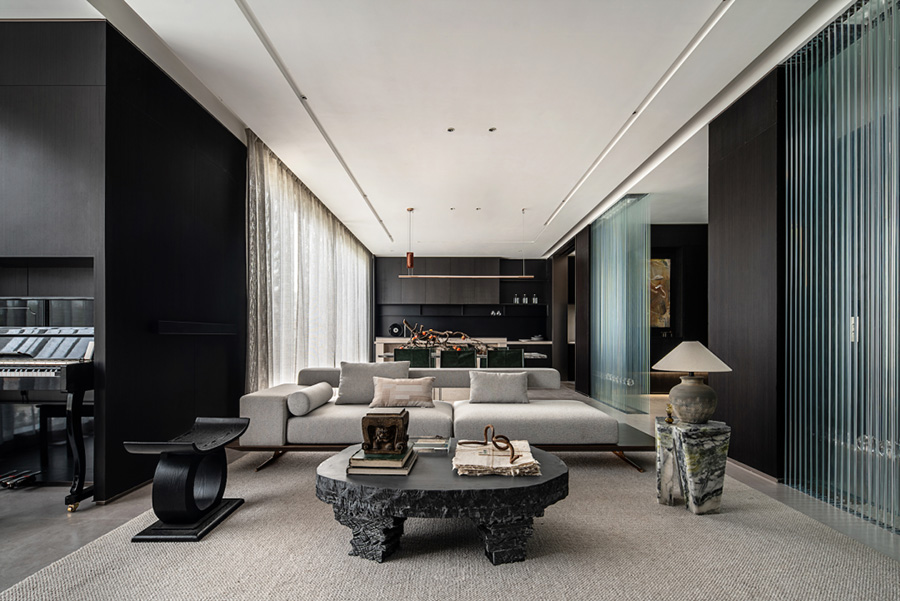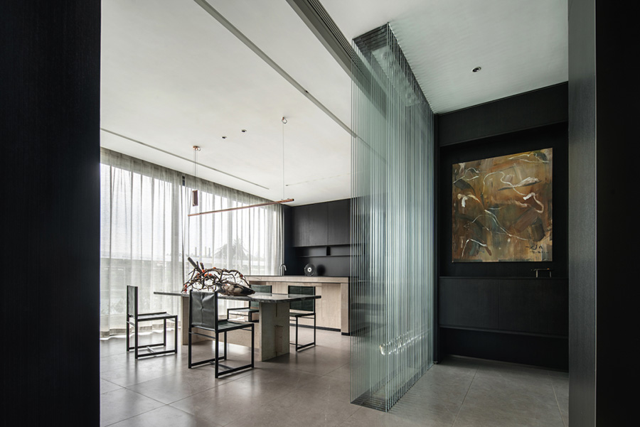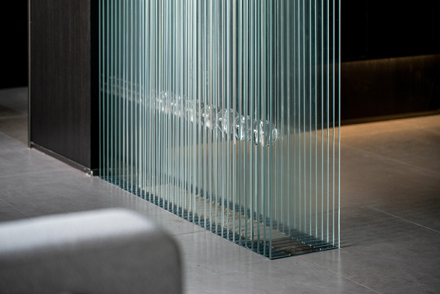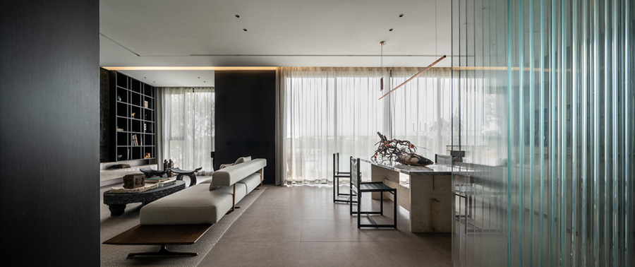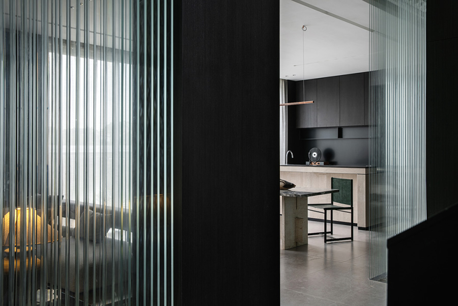 人類穿越空間的過程,本身就是一種漫游,氣氛激發(fā)想象,有限度地由沉浸式引導(dǎo)通感,然后通過空間重構(gòu)喚醒身體和感覺的感知。起居室內(nèi)玻璃的輕盈與石材的厚重感形成視覺上的對(duì)撞,粗糙和光滑之間的摩擦,和傳統(tǒng)園林中關(guān)于“石壁”和“瀑布”的直覺和想象。