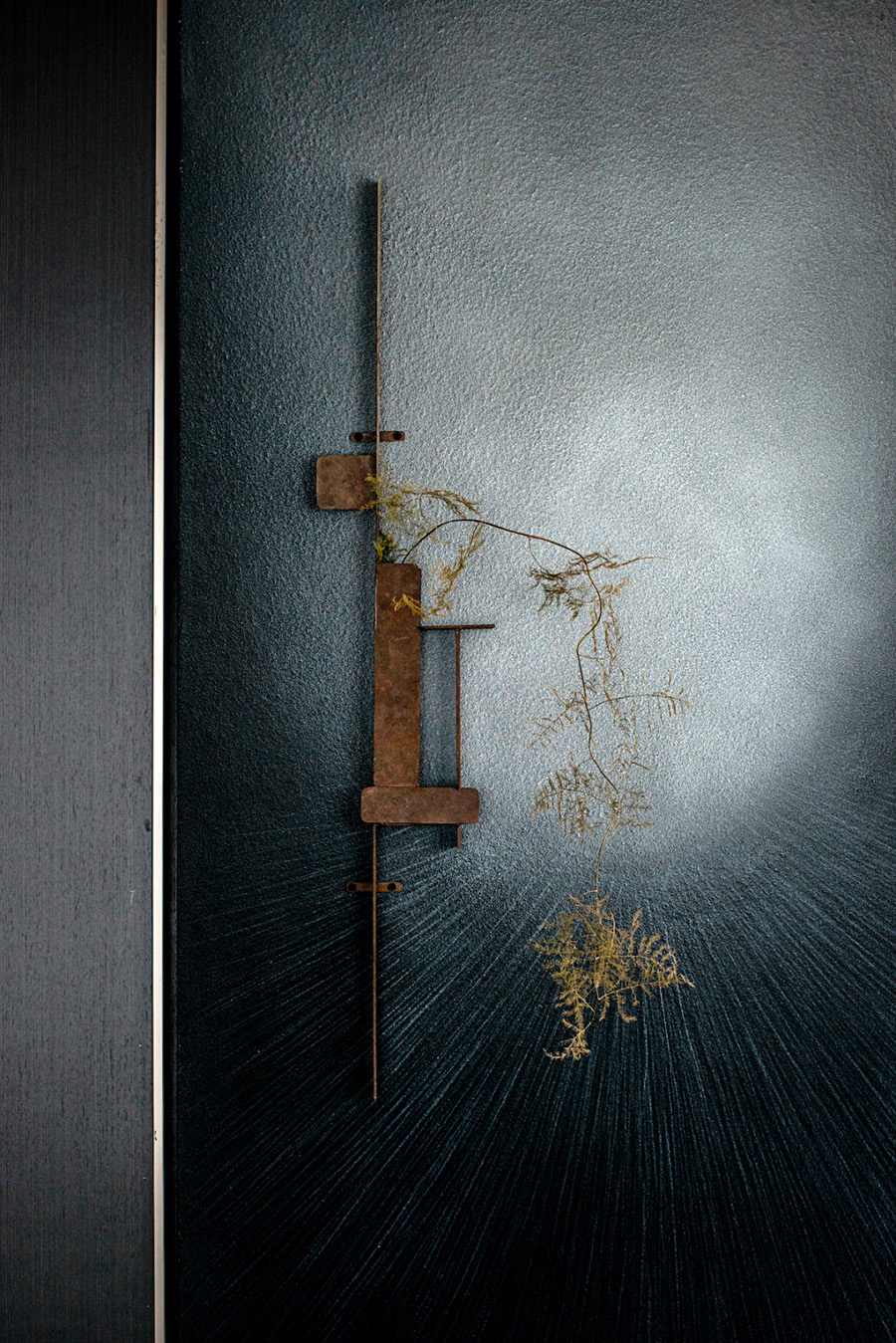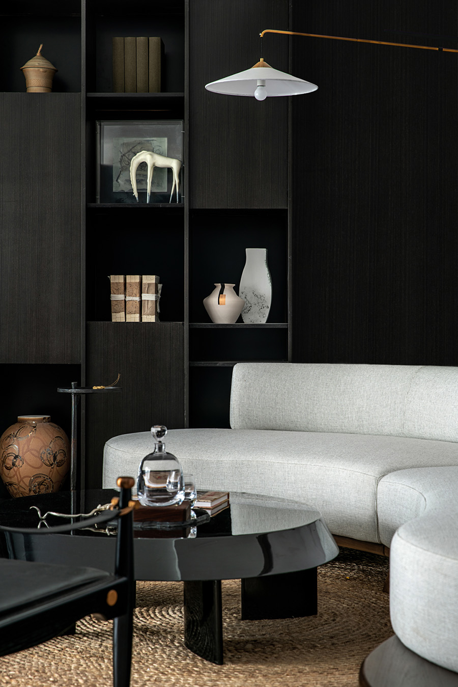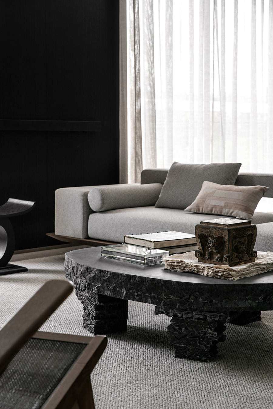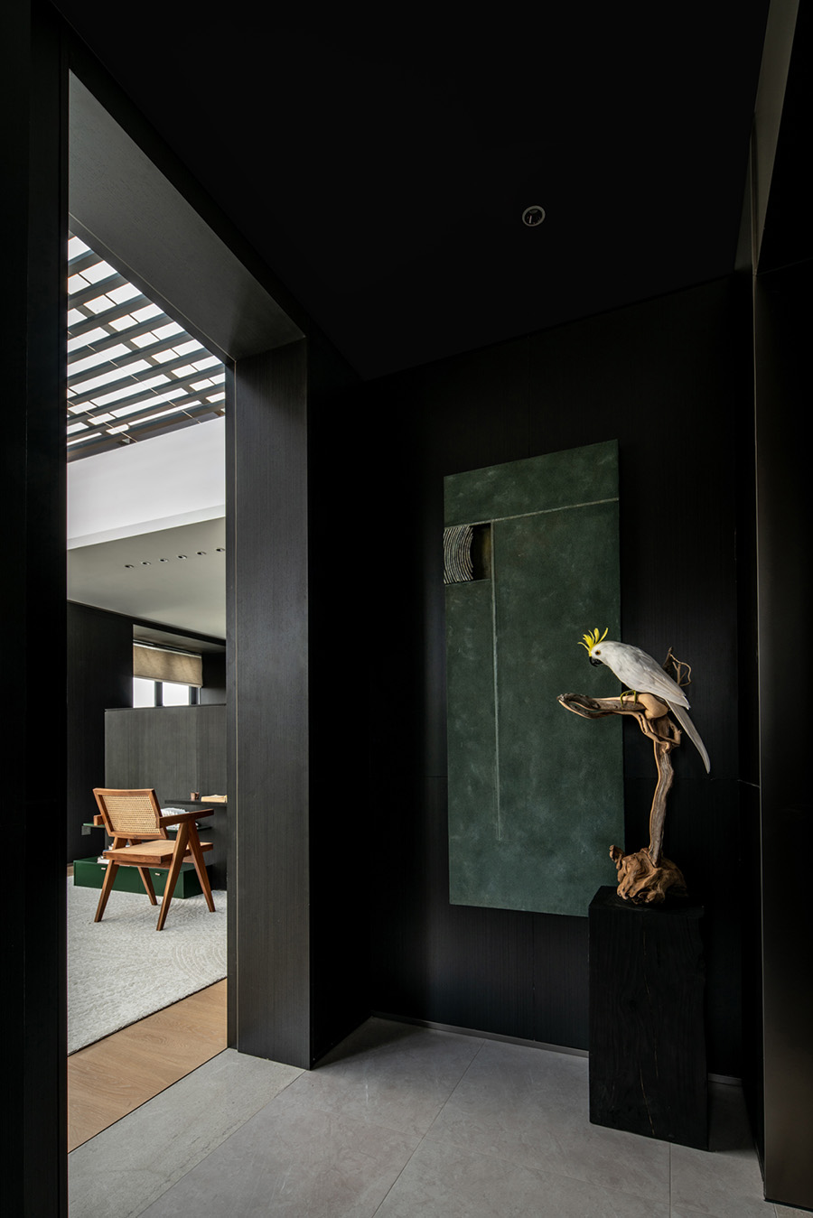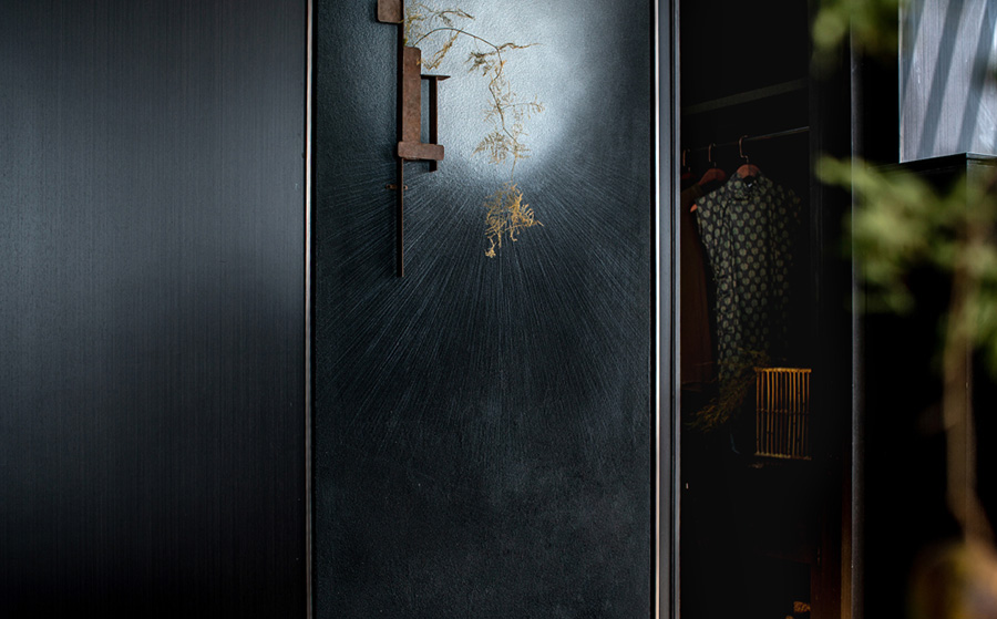 人類穿越空間的過程,本身就是一種漫游,氣氛激發(fā)想象,有限度地由沉浸式引導(dǎo)通感,然后通過空間重構(gòu)喚醒身體和感覺的感知。起居室內(nèi)玻璃的輕盈與石材的厚重感形成視覺上的對(duì)撞,粗糙和光滑之間的摩擦,和傳統(tǒng)園林中關(guān)于“石壁”和“瀑布”的直覺和想象。