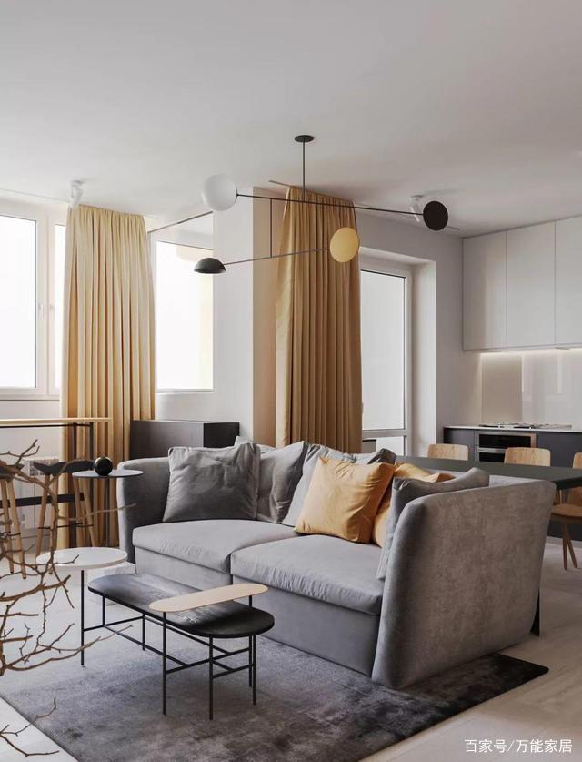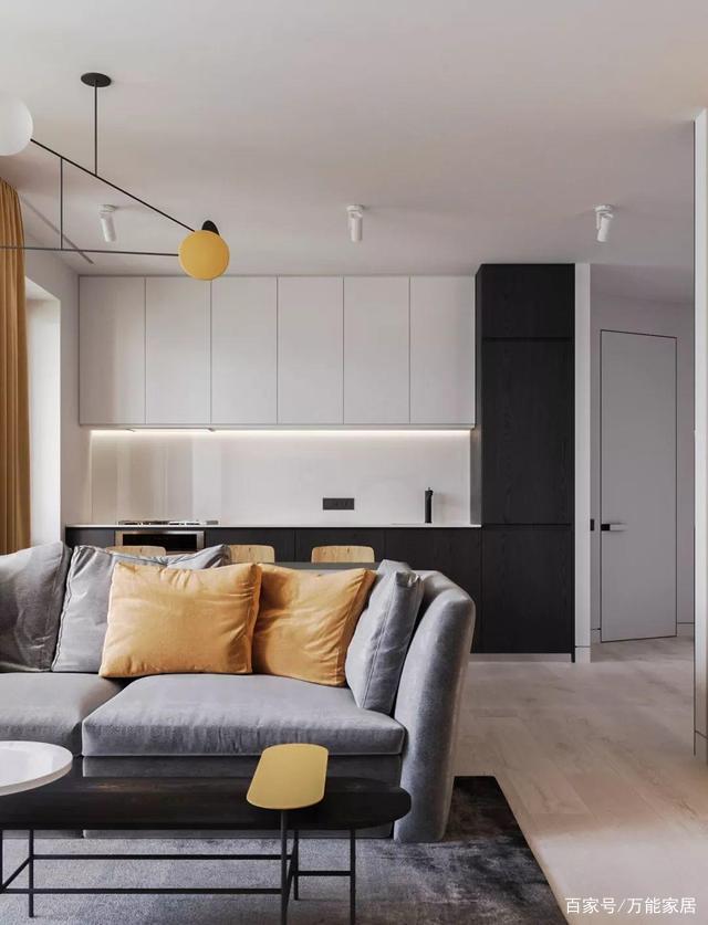 除了黑白灰的色彩搭配,整體空間還融入了黃色元素,黃色的抱枕、布簾、燈飾等,讓素雅的空間頓時(shí)靈動(dòng)和活潑起來(lái)。