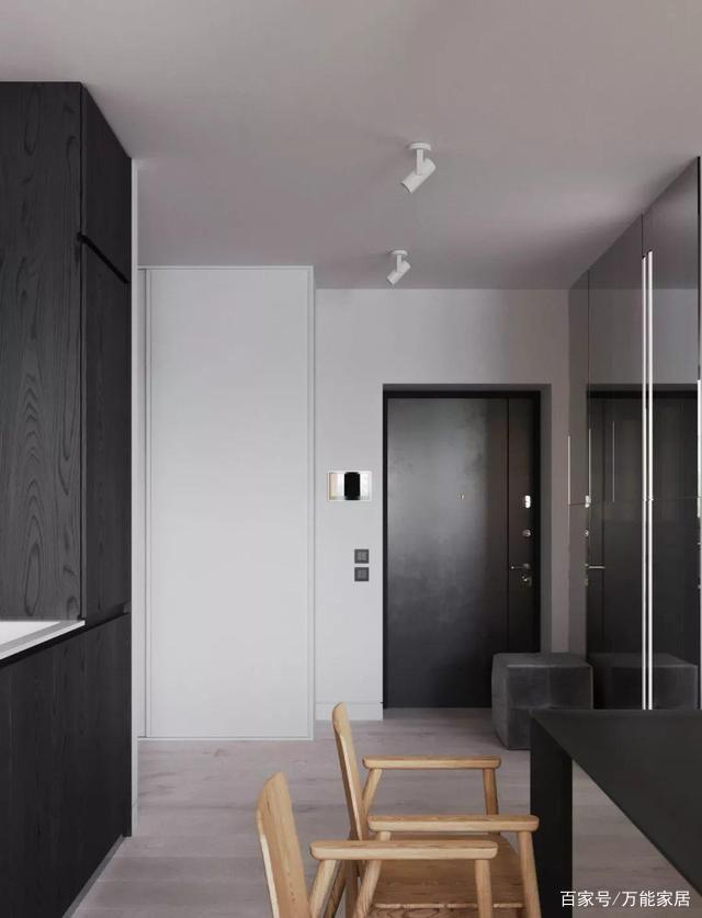 玄關(guān)處整體墻面、天花板采用白色為主色調(diào),讓小空間更顯通透明亮,鏡面柜門設(shè)計(jì)也在視覺上起到擴(kuò)充空間的效果。