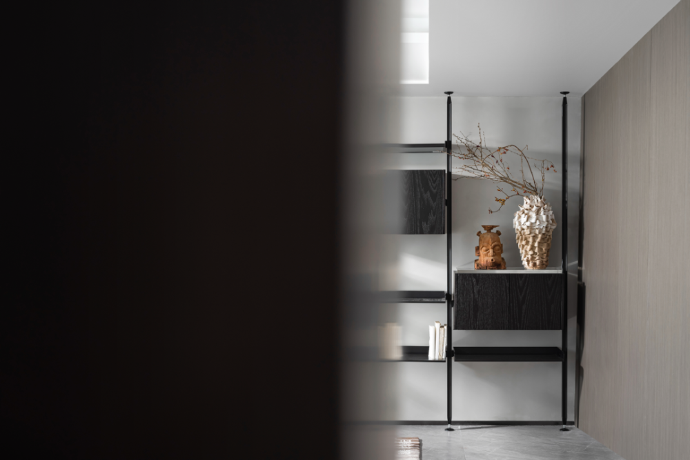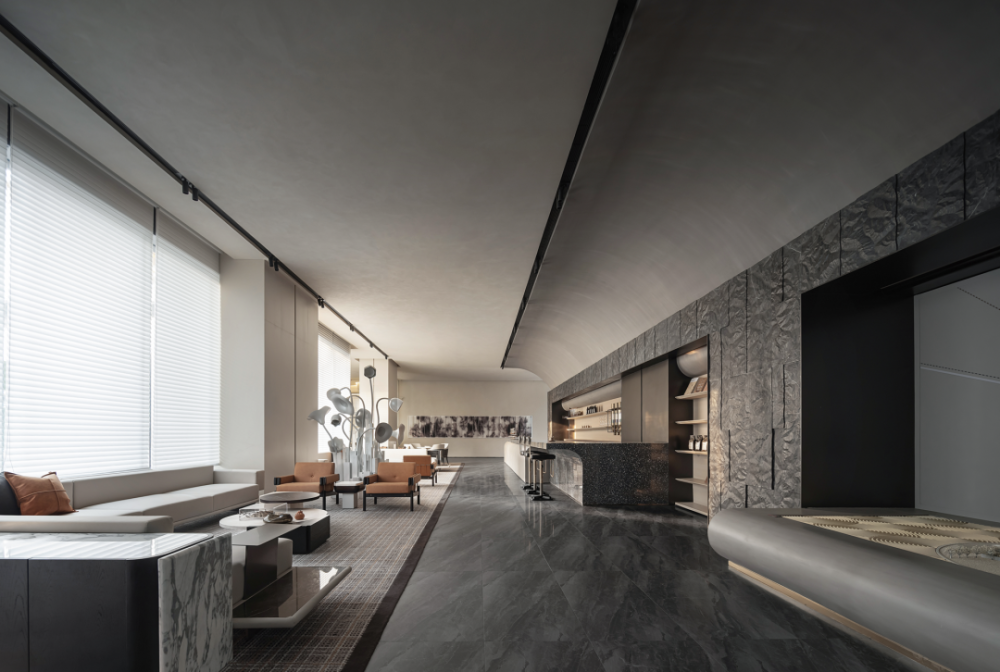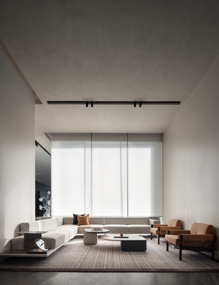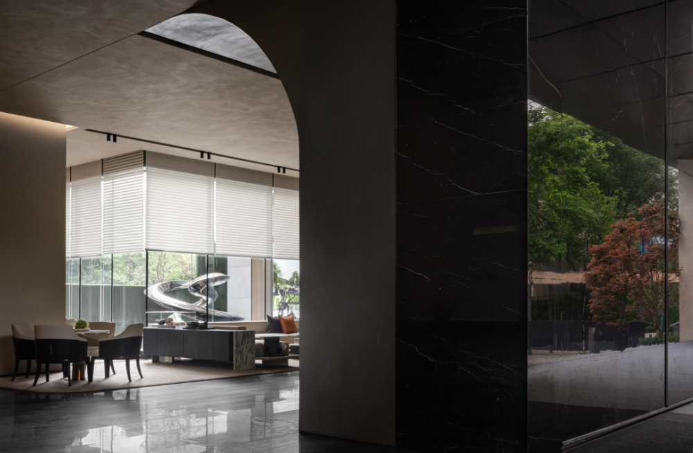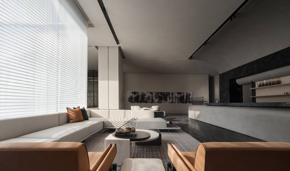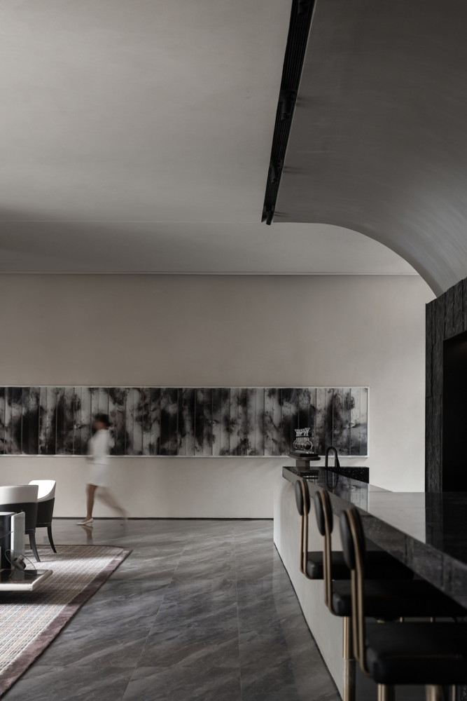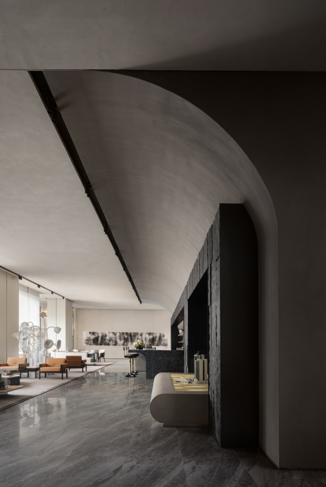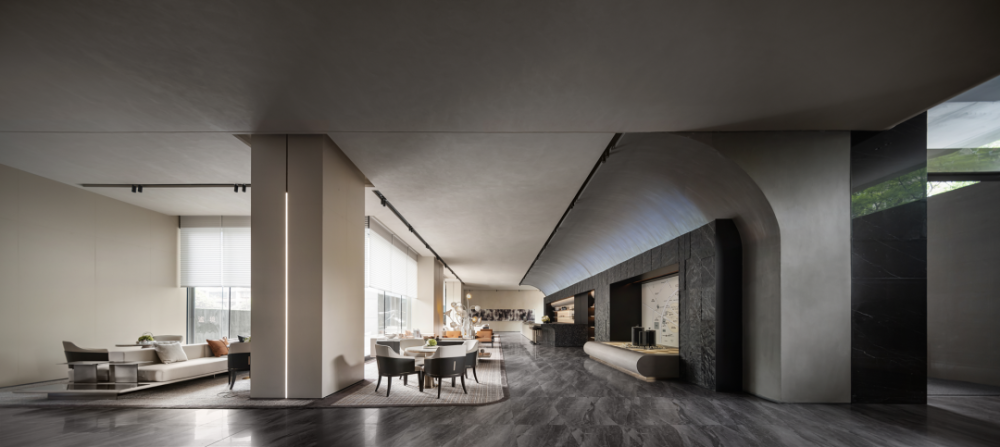 從灰色的前廳進(jìn)入,整個空間平面疏朗平緩,區(qū)域的形成并不依賴確定性的邊界,更多是由空間的場景感所引導(dǎo)。