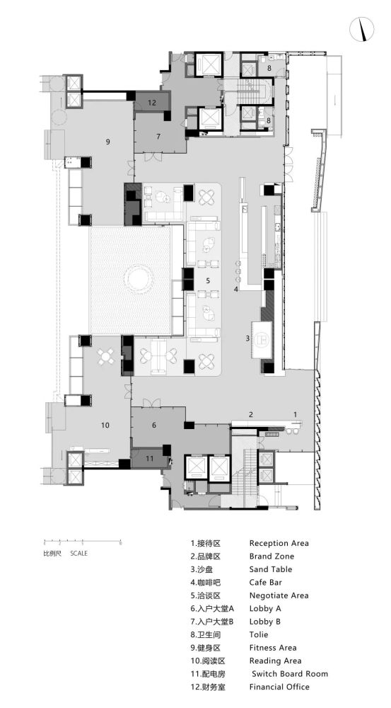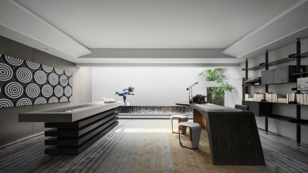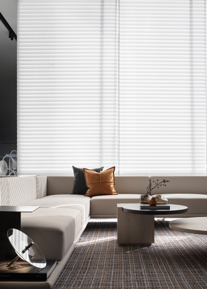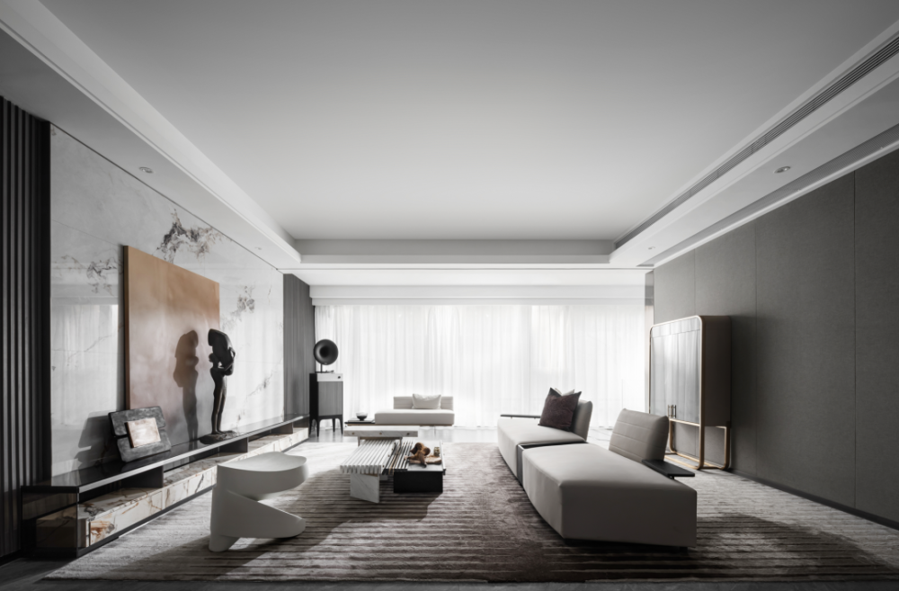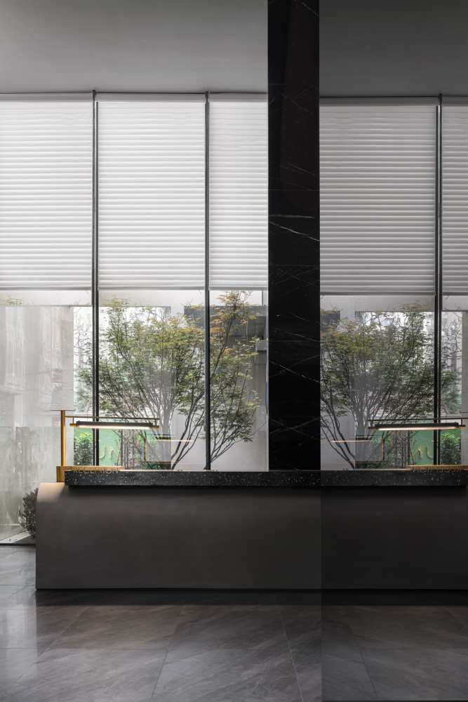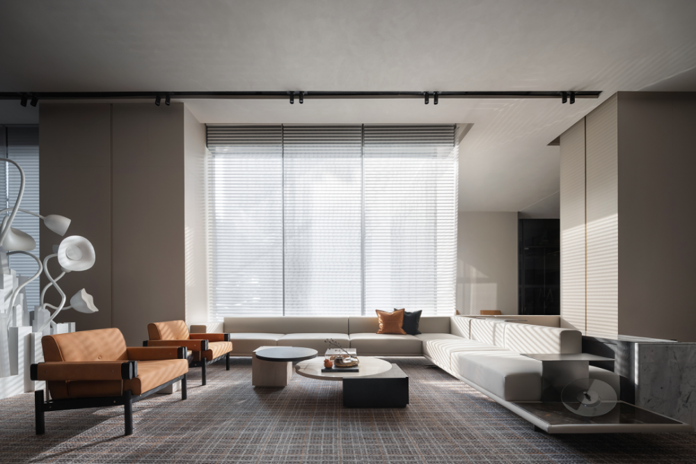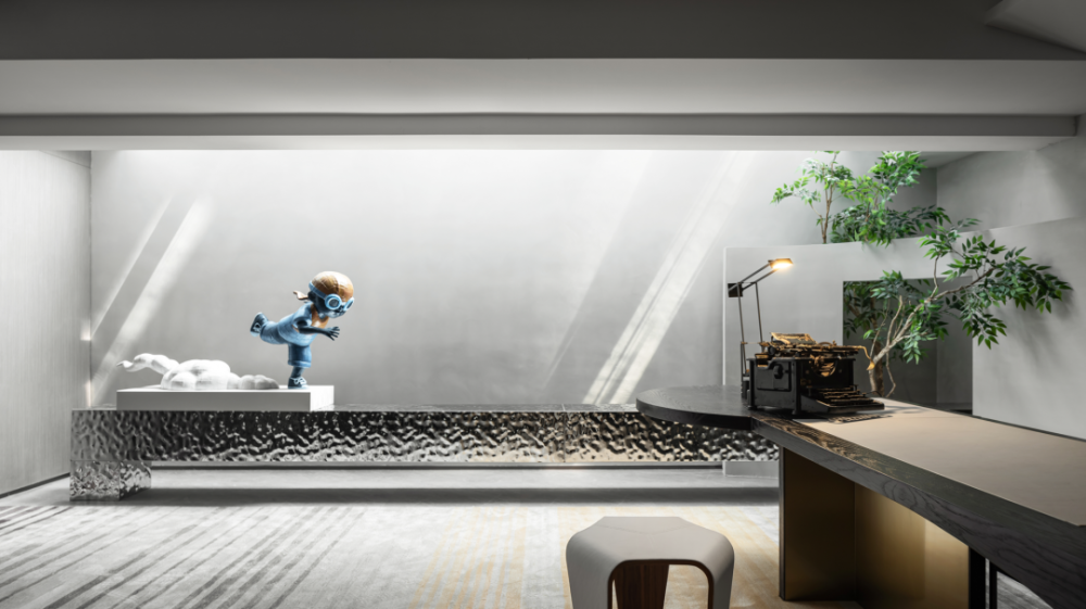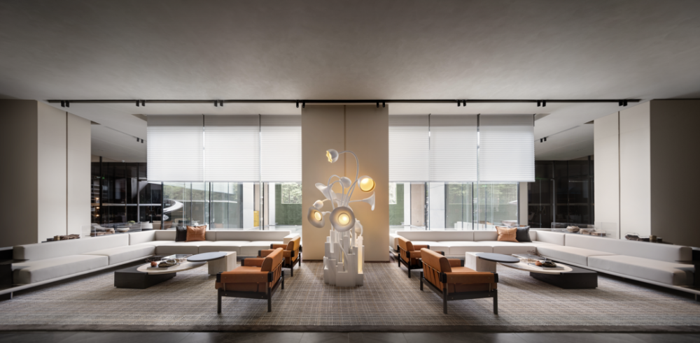 從灰色的前廳進(jìn)入,整個空間平面疏朗平緩,區(qū)域的形成并不依賴確定性的邊界,更多是由空間的場景感所引導(dǎo)。