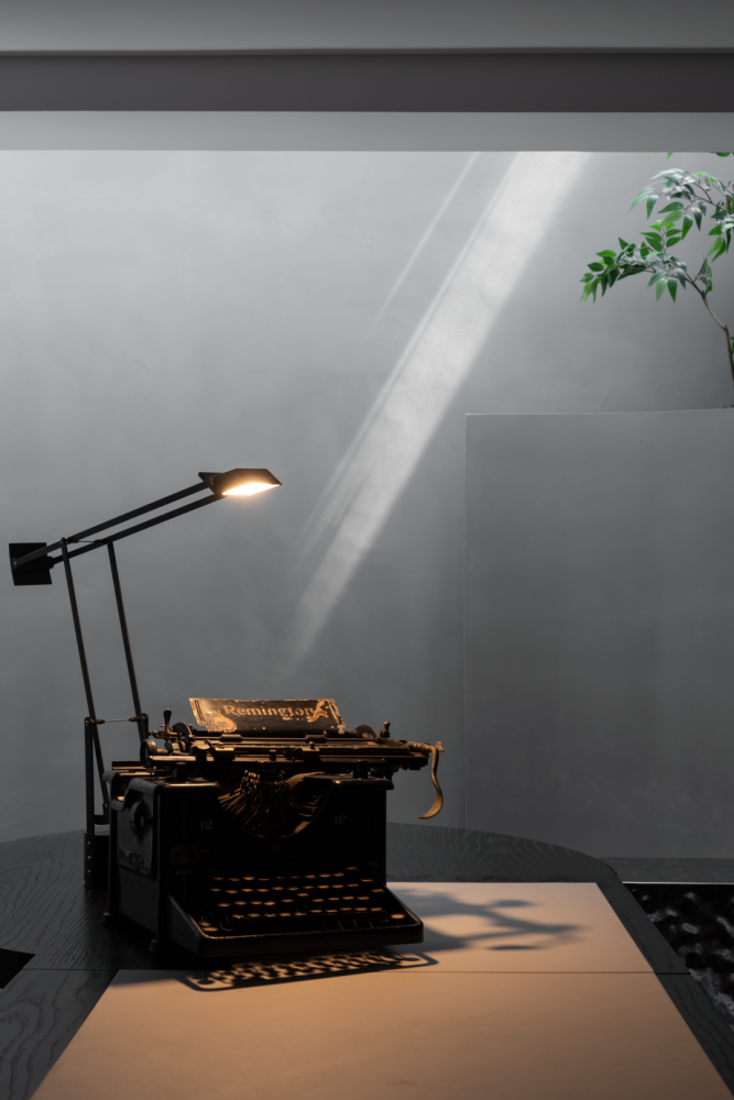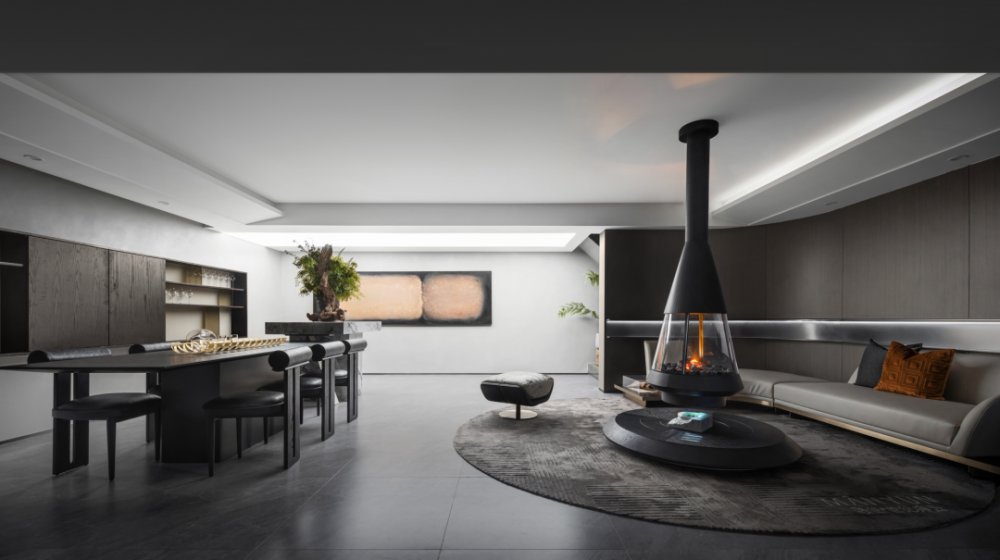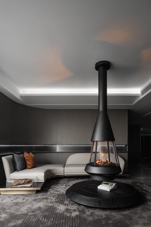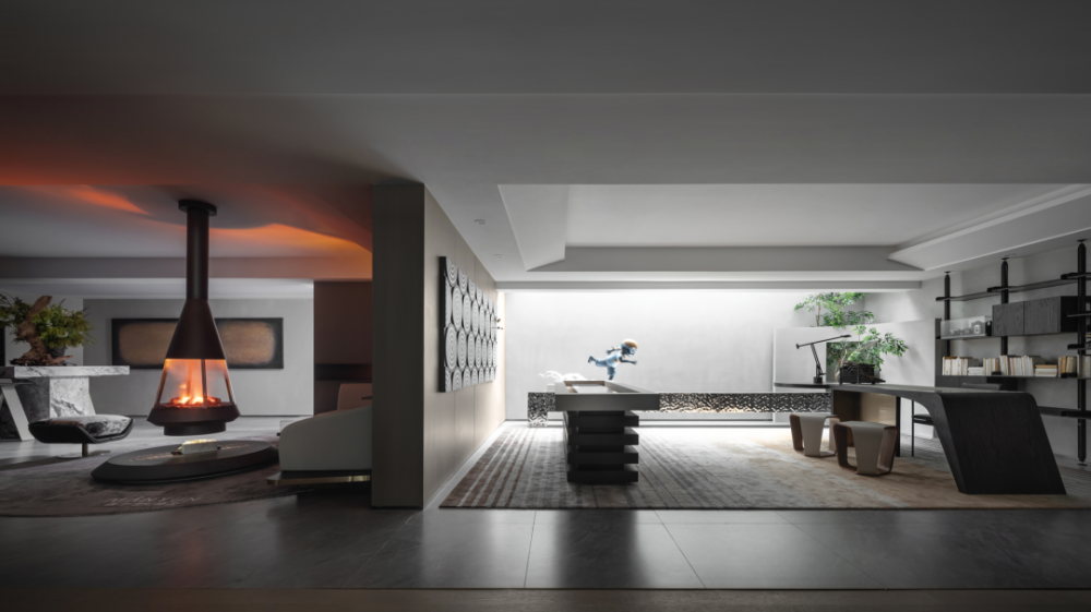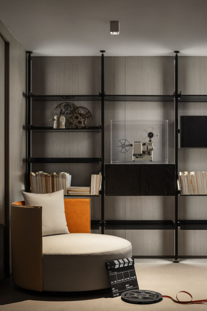 在負(fù)一層的公共活動區(qū),老式打字機、電影膠片、老式電影放映機等眾多老物件,以藝術(shù)收藏的方式進(jìn)入空間細(xì)節(jié);帶有古典意蘊的書案和置于中心位置的火塘,則以傳統(tǒng)的形態(tài)參與進(jìn)現(xiàn)代生活。位于空間最內(nèi)側(cè)采光天井,使得陽光洗墻而下,現(xiàn)在時與過去時交融,新的感知被某種瞬時性所激活。