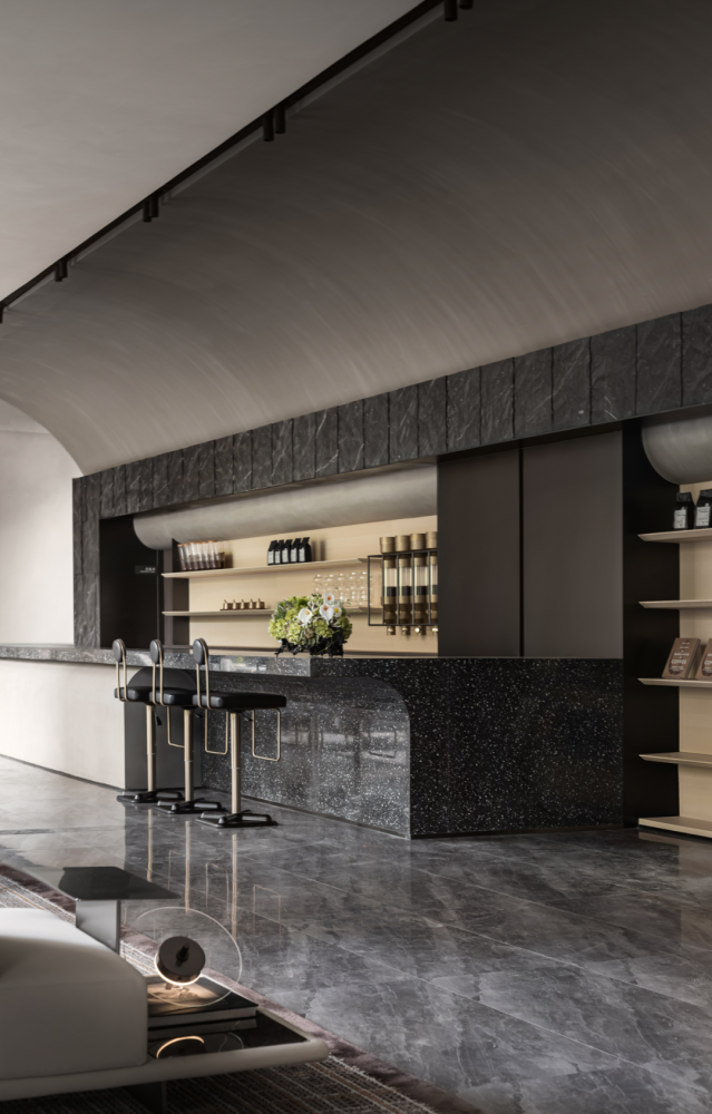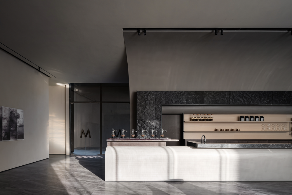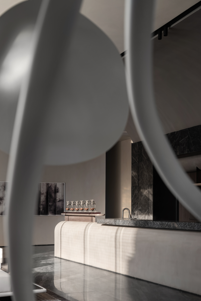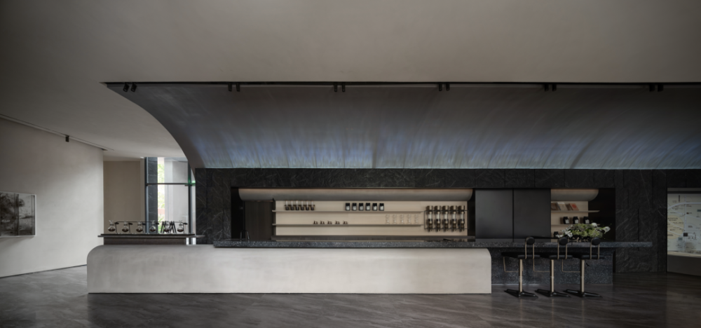 沙盤區(qū)域咖啡吧臺在前續(xù)的位置上相連,確立著空間動線的方向。與此同時,巨大的微水泥弧形曲墻面構(gòu)筑物,將沙盤與咖啡吧臺微微向內(nèi)包裹,營造出輕松而熙攘的都市街頭氛圍。