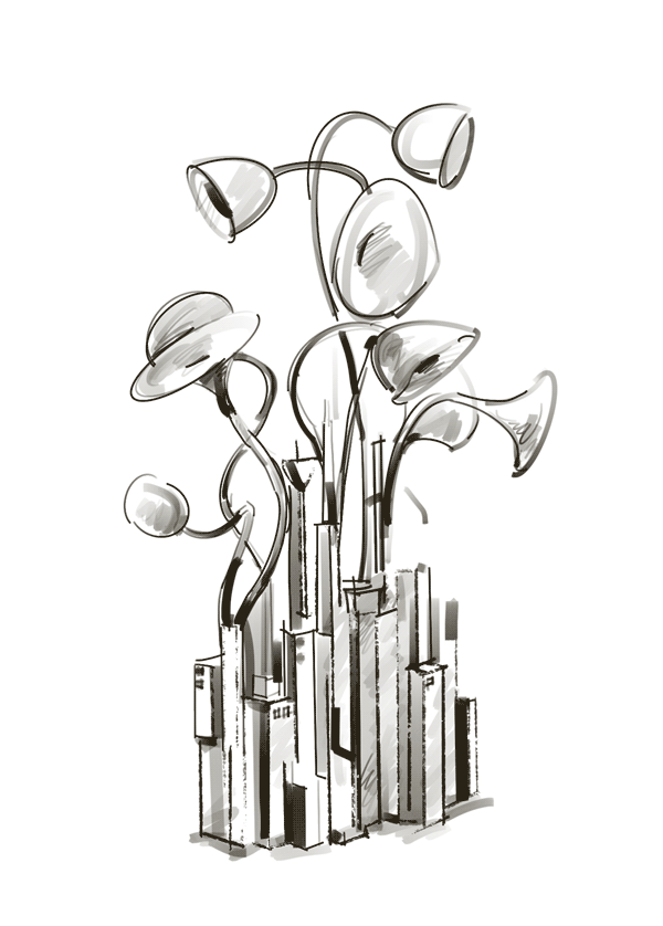 代表融合共生的原創(chuàng)性藝術(shù)裝置,位于兩組沙發(fā)座椅中間。以成都老城區(qū)建筑形態(tài)為底座,以蔓延向上生長的花朵為生命形態(tài),暗示著城市新舊文化共生、人文與自然共處的美好憧憬。