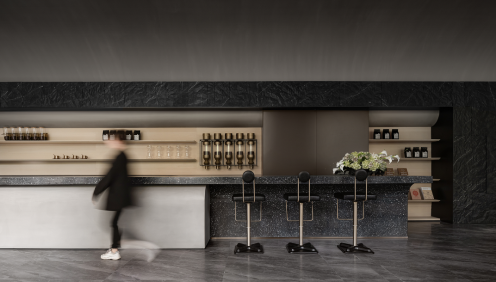 咖啡店是實現(xiàn)宜居性與度假感的空間載體。既能兼顧項目前期的地產(chǎn)銷售功能,也能在更長遠(yuǎn)的未來成為業(yè)主私人生活與城市文化日常相互疊交與轉(zhuǎn)換的中間地帶。它介于日常與度假之間,隱匿在市井與街頭之內(nèi),是具體日常生活的延伸,是喧囂與靜謐的自然過渡。
