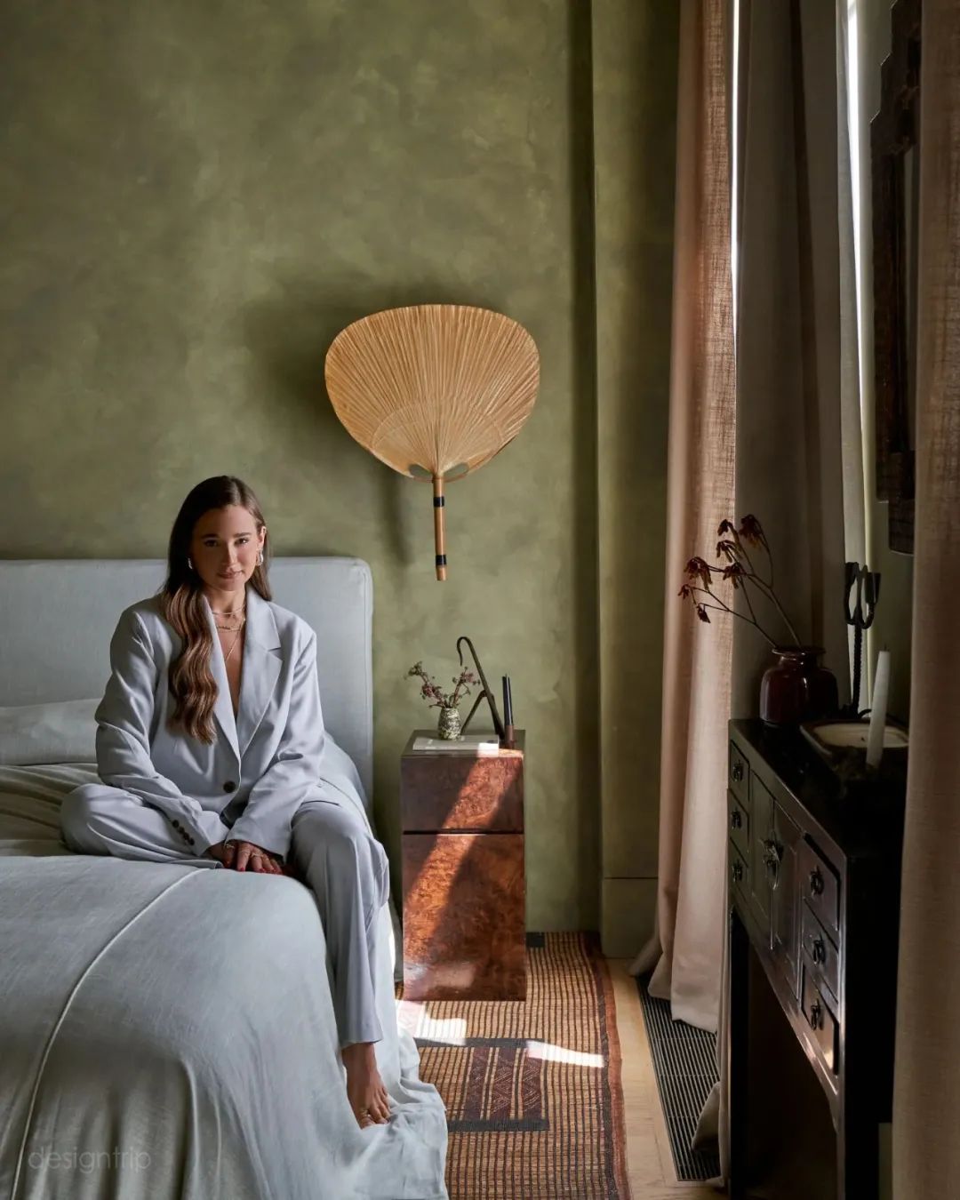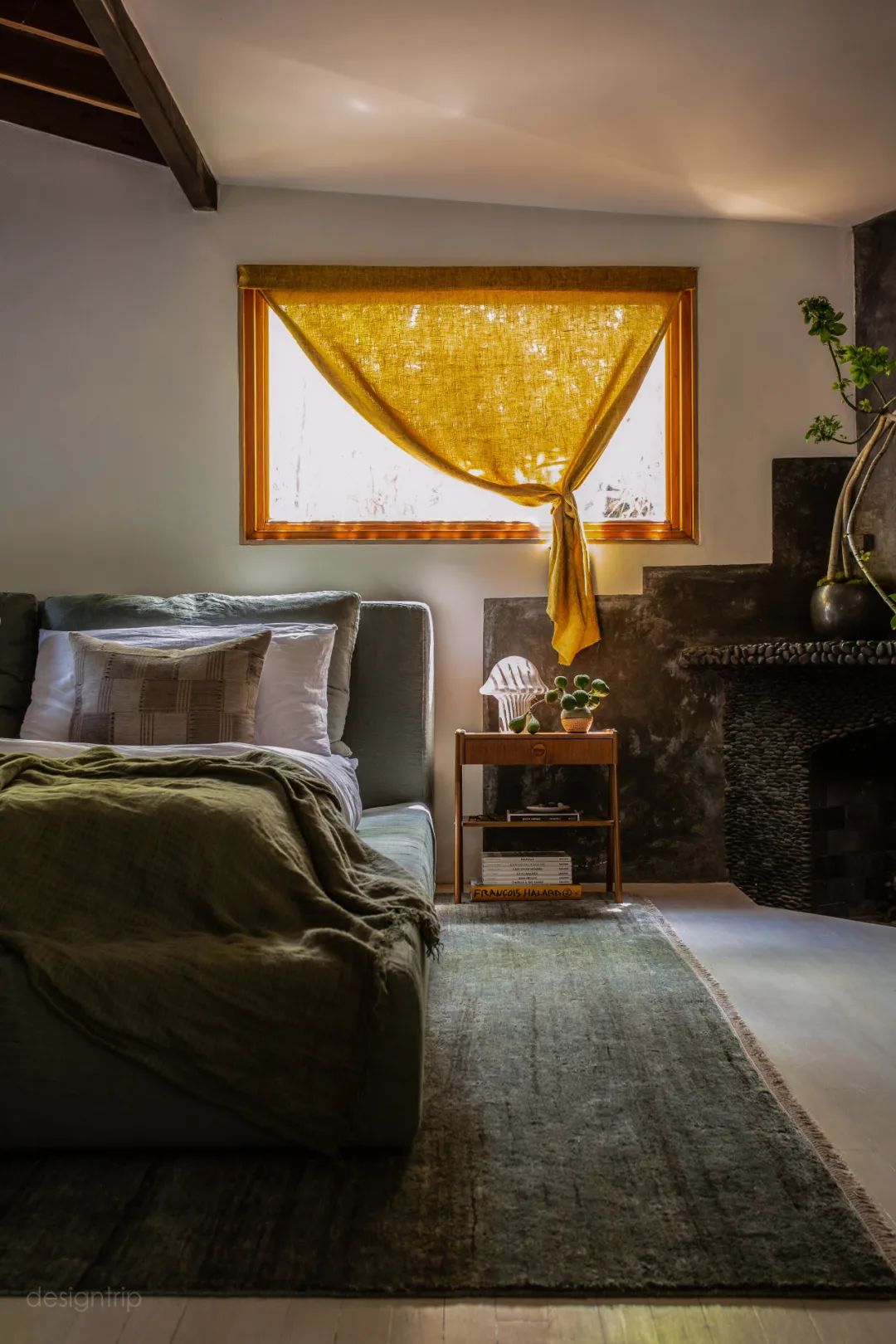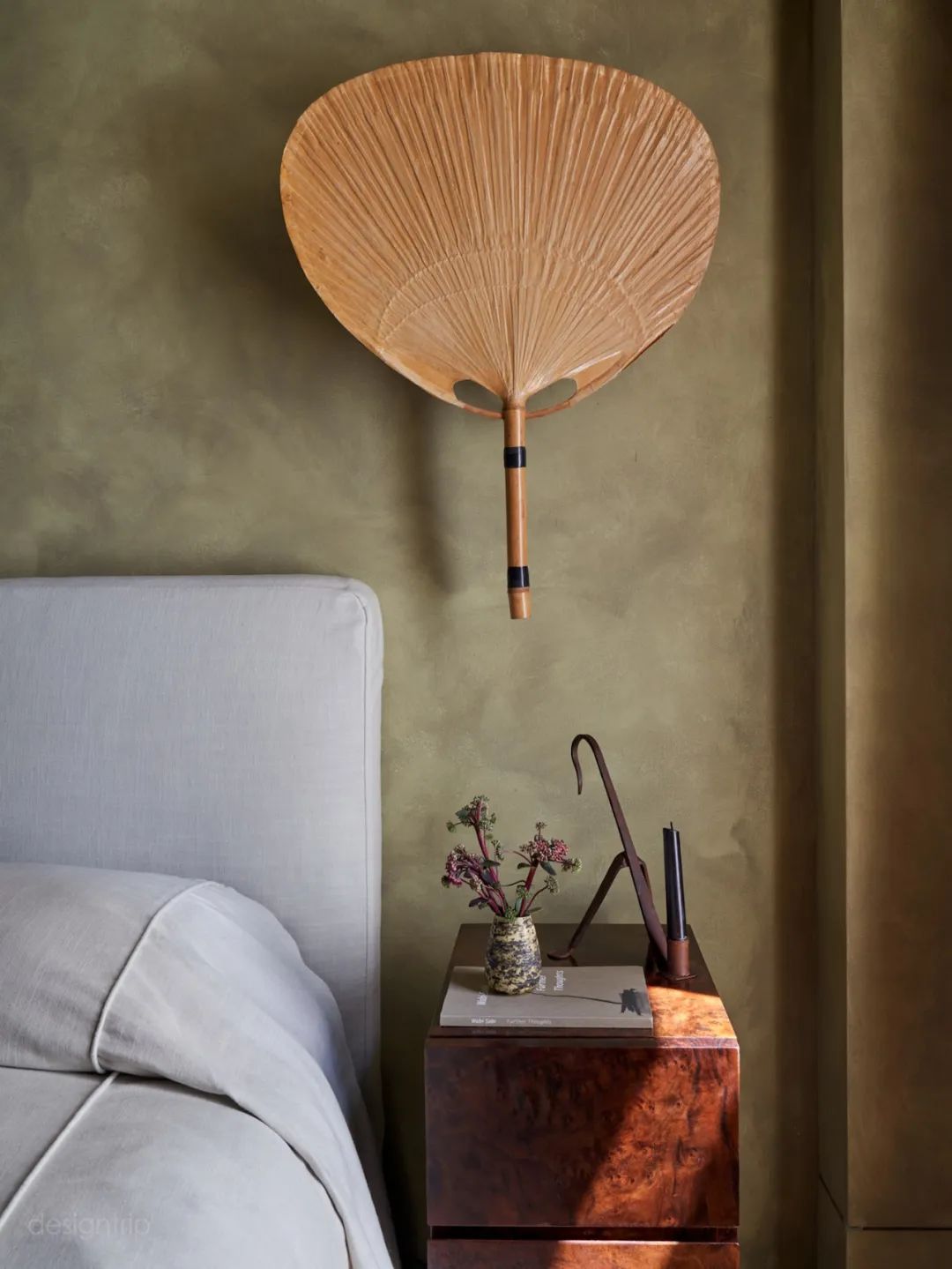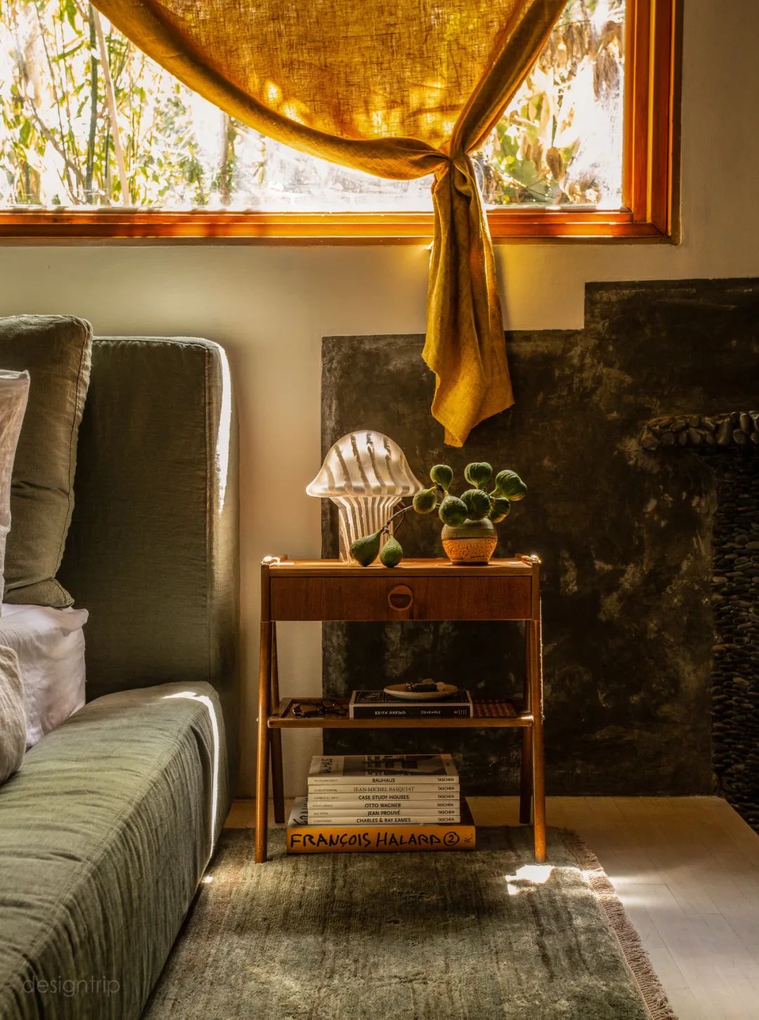 主臥室的墻壁刷上了柔和的橄欖色,為Danielle 的復古家具展出打造了一個具有觸感的背景。低飽和度的窗簾盛邀戶外光線和景觀的演出,復古的家具有條不紊地講述它們的故事;一把質(zhì)樸的蒲扇將人引入了一個無限懷念的過去里,那里是自然的天地,隨風而起的是陣陣的竹香。