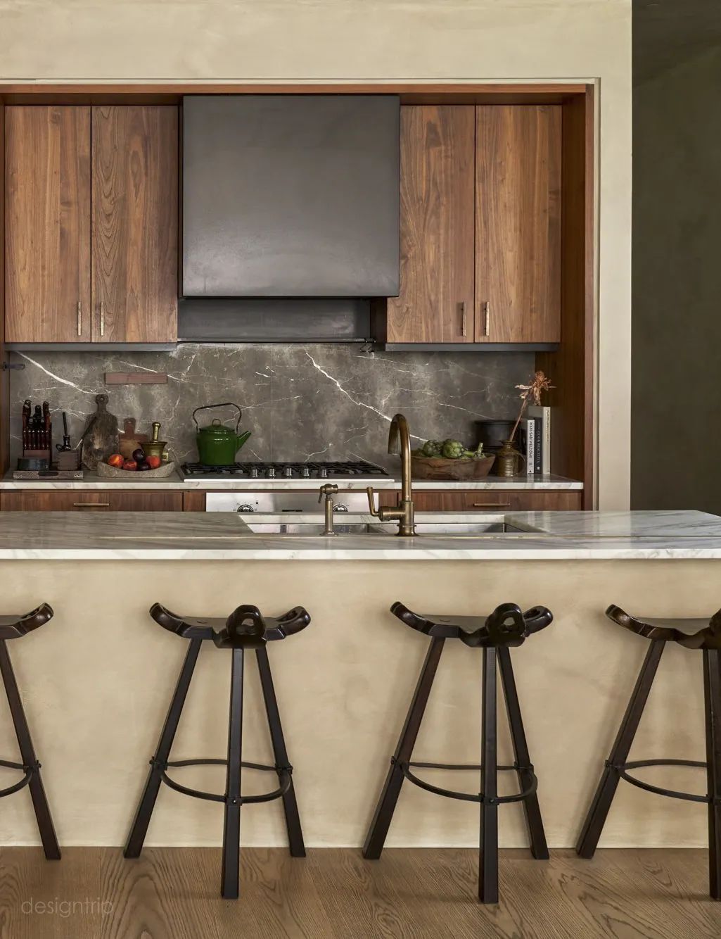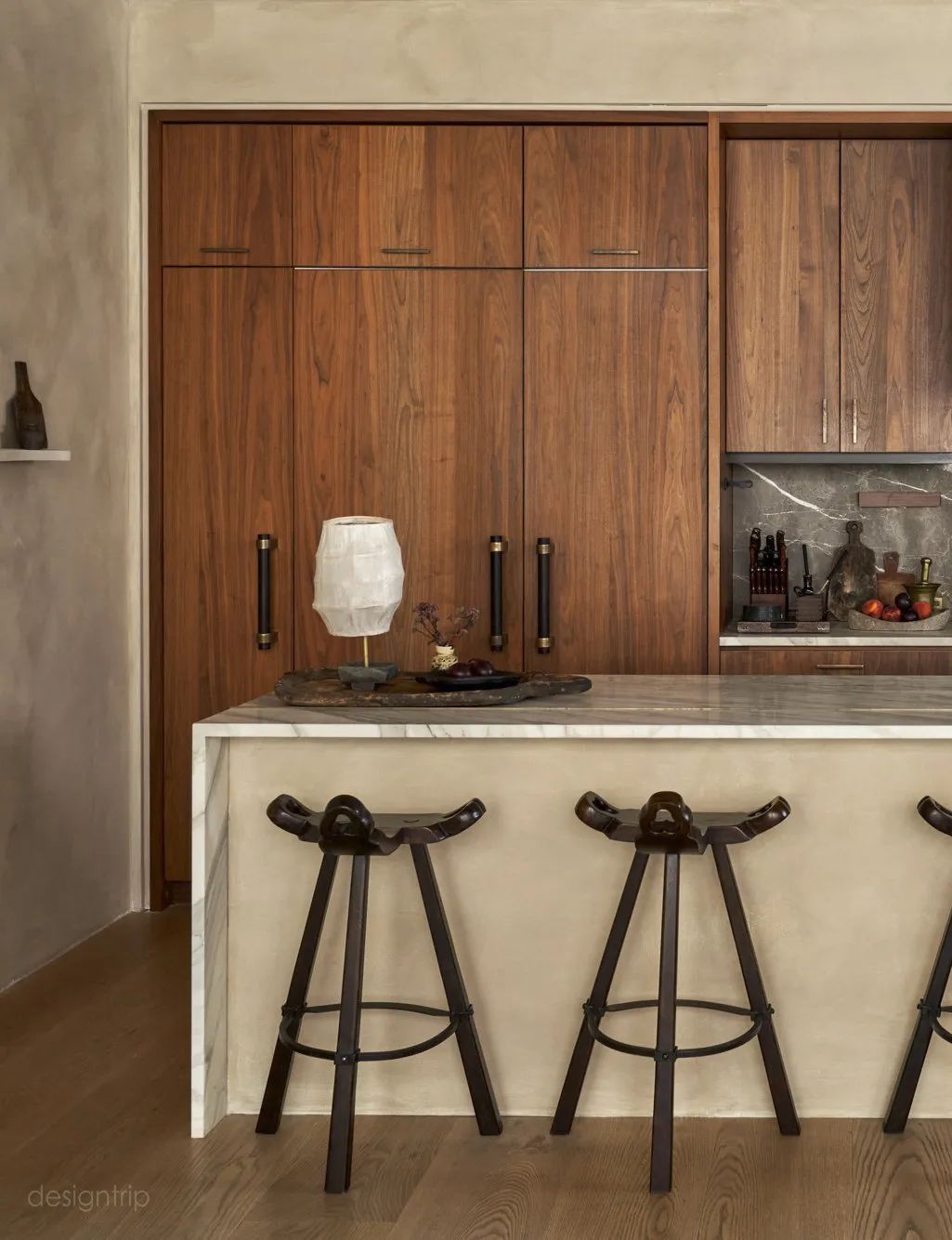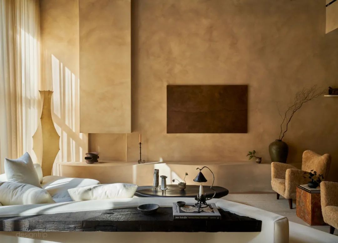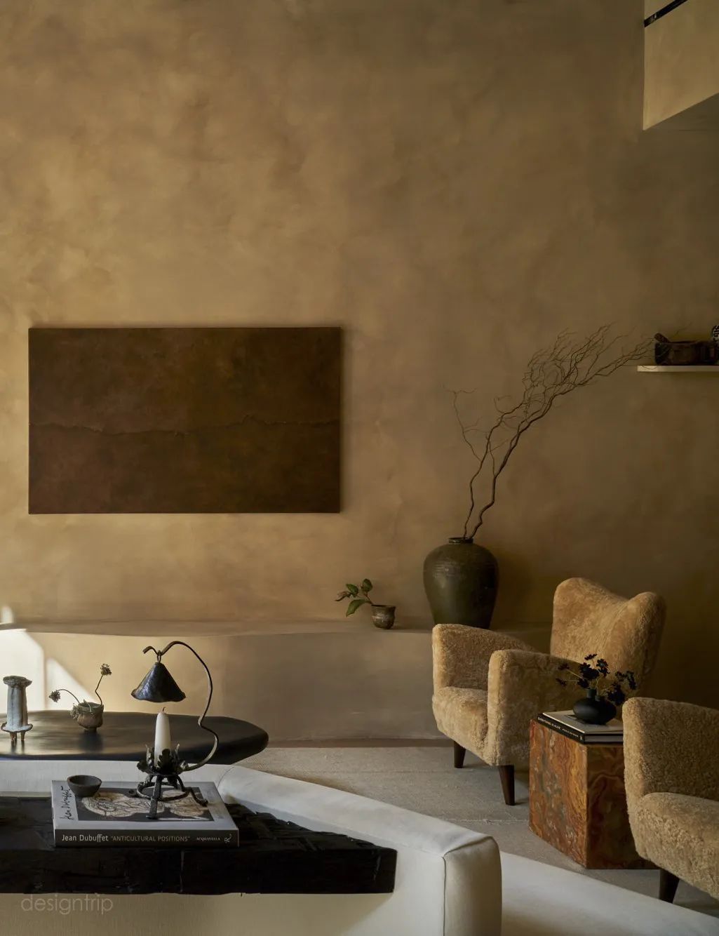 Lauren的審美非常傾向于侘寂,她十分關(guān)注瑕疵的感覺,這也讓她在石膏身上看到了這種屬于瑕疵的美。石膏不僅可以承受磨損,且有豐富的色調(diào)變化,對于一所侘寂來說十分受用。于是,在設計偏向于溫暖的臥室里,Lauren亦將石膏作為墻面裝飾的一部分,還搭配了光滑鵝卵石制成的壁爐、樹枝,捕捉了天然的藝術(shù)特性。