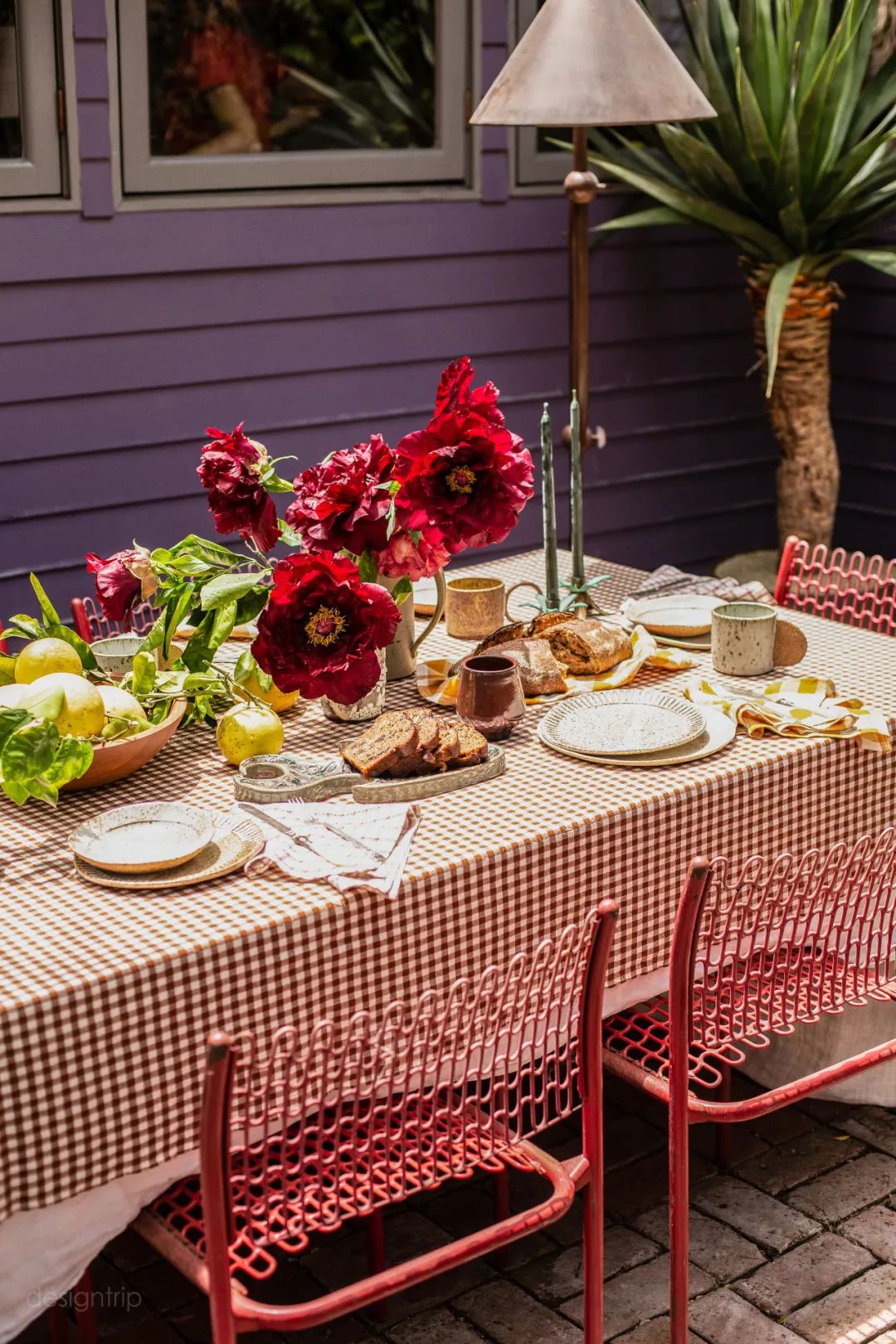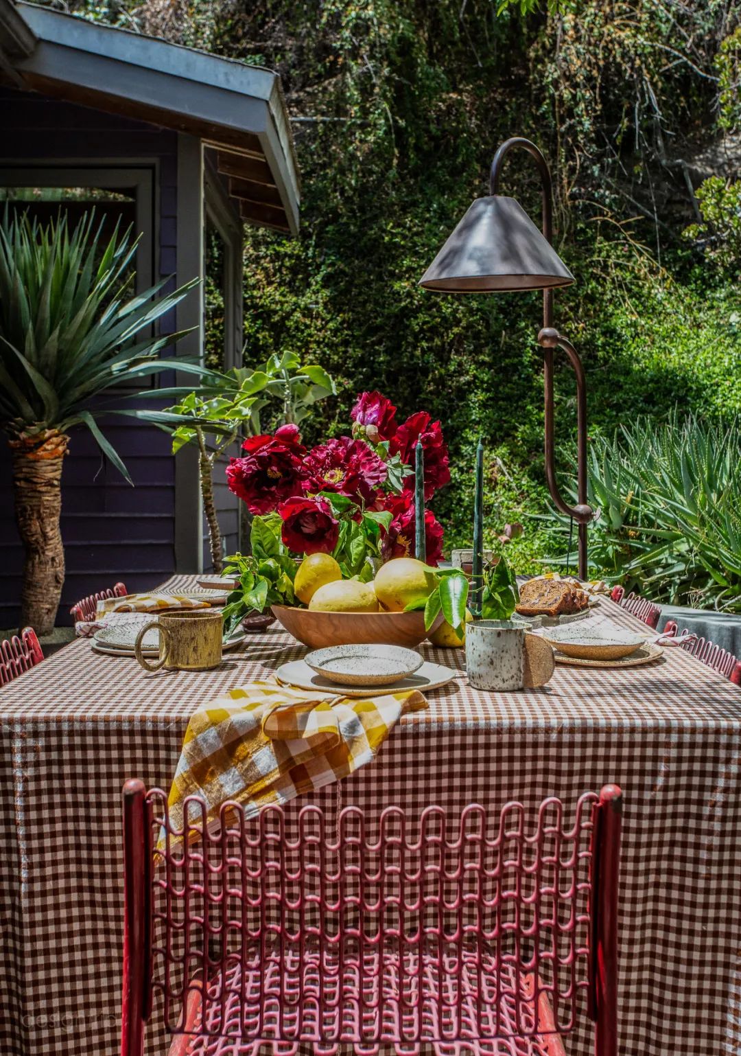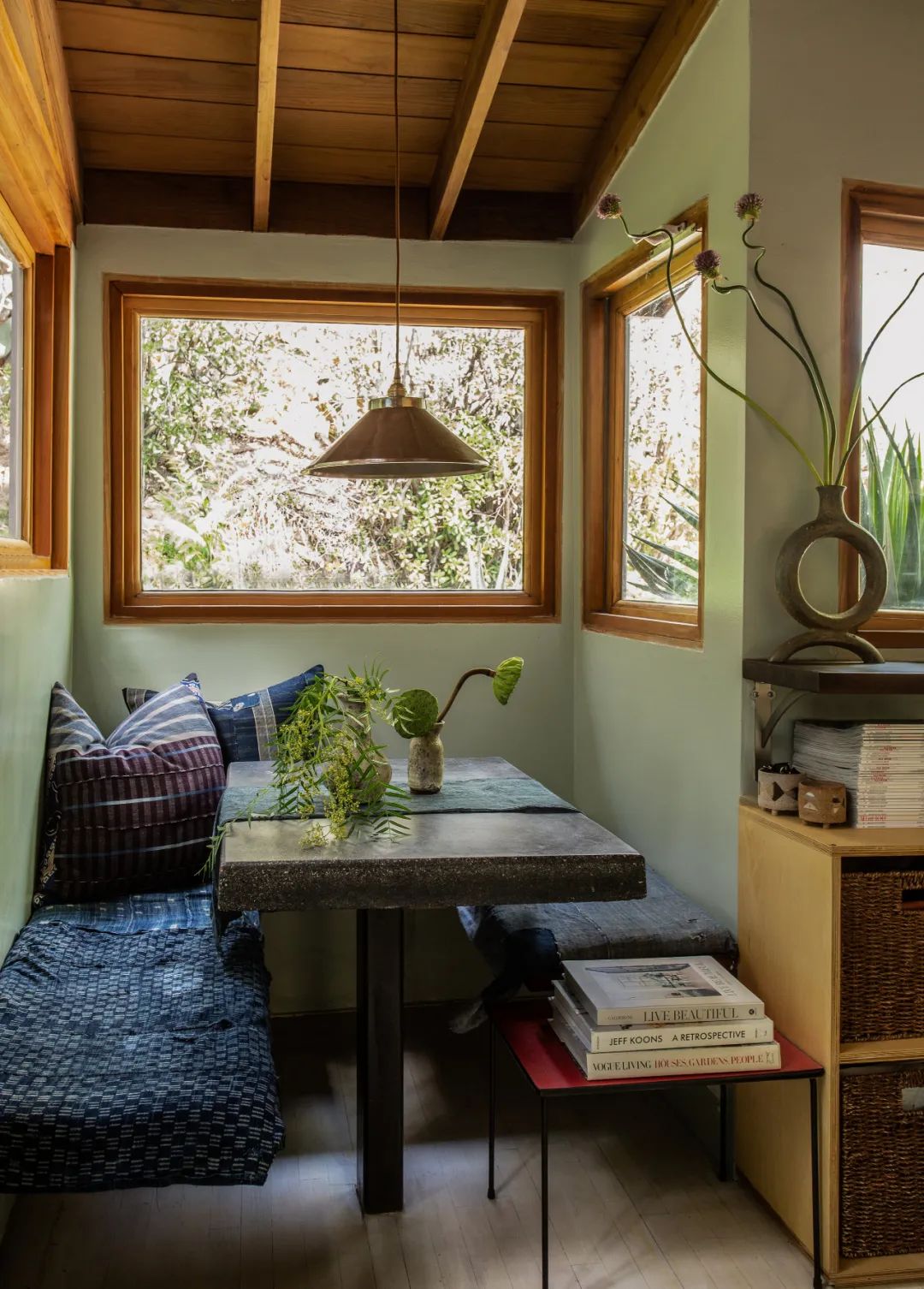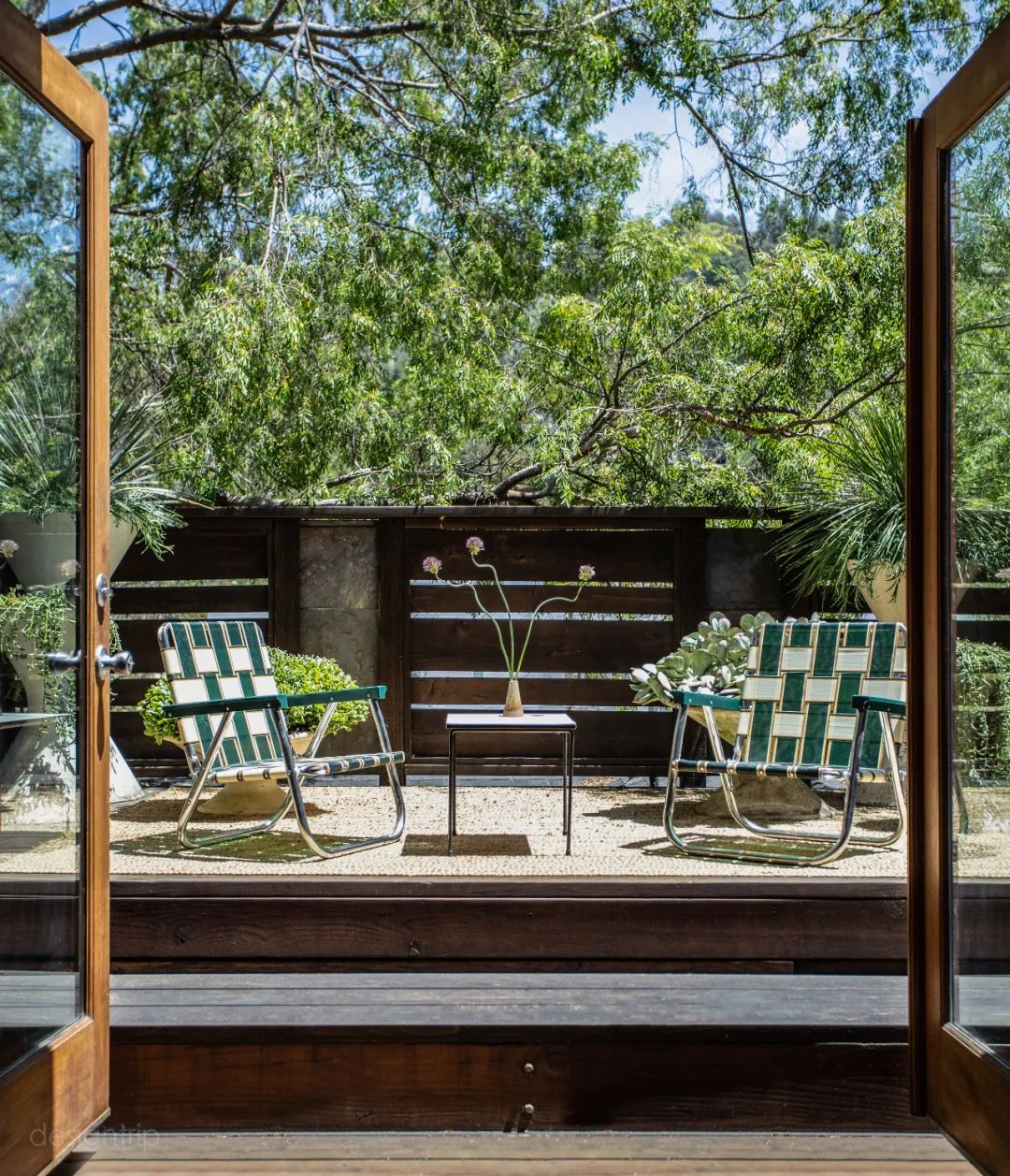 連接起居室的后天井有一個開放式甲板,上面有一棵樹,它延伸到外面的陽臺上。Lauren帶來了許多多肉盆栽,還有戶外的座椅及地毯,以創(chuàng)造一個可以坐在外面喝咖啡并放松的空間。她喜歡室外營造更多的氛圍,甚至打造了一個戶外的餐廳,以享受洛杉磯的綠樹成蔭。