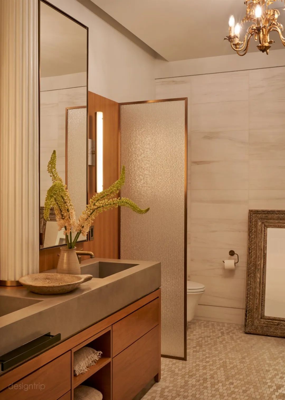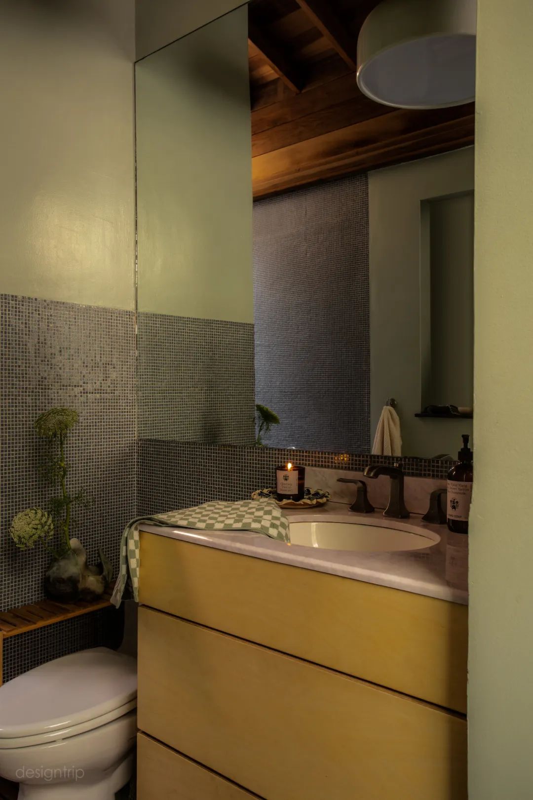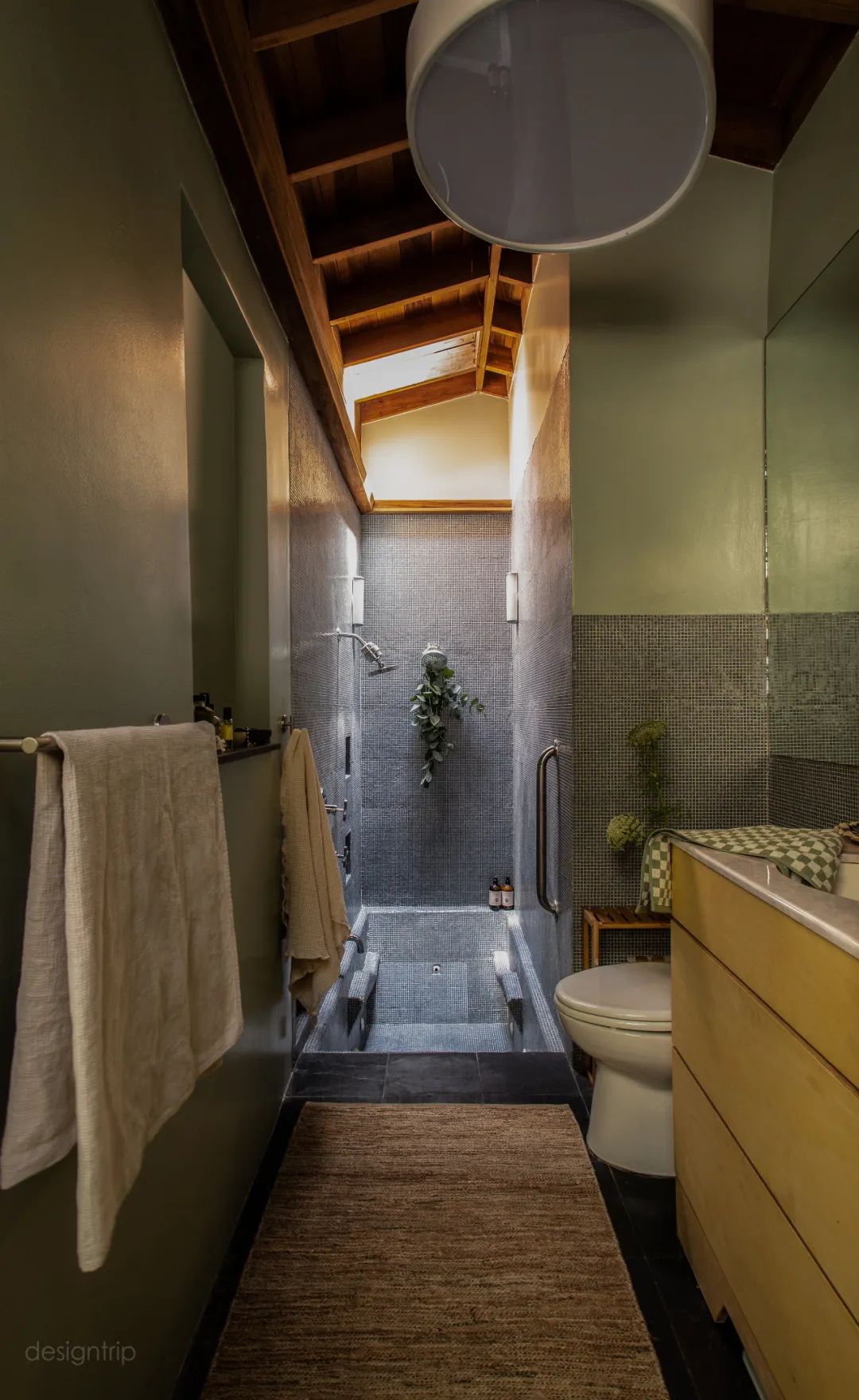 Lauren在改造這間住宅的浴室時借鑒了日本的浴室設計,后者顯然給予了她的靈感,比如日本浸泡浴缸,可以讓她在全身心地進入洗塵的過程;又比如日本緊湊的布局正適用于這間面積不大的浴室,于是更為強調(diào)溫暖的居住感和生活氣息。