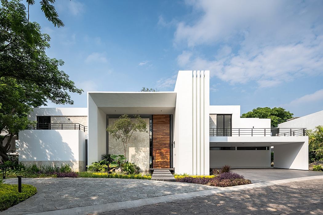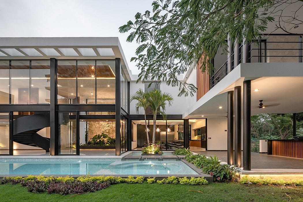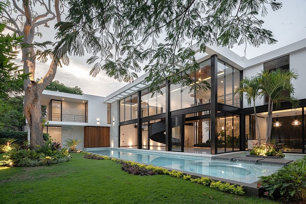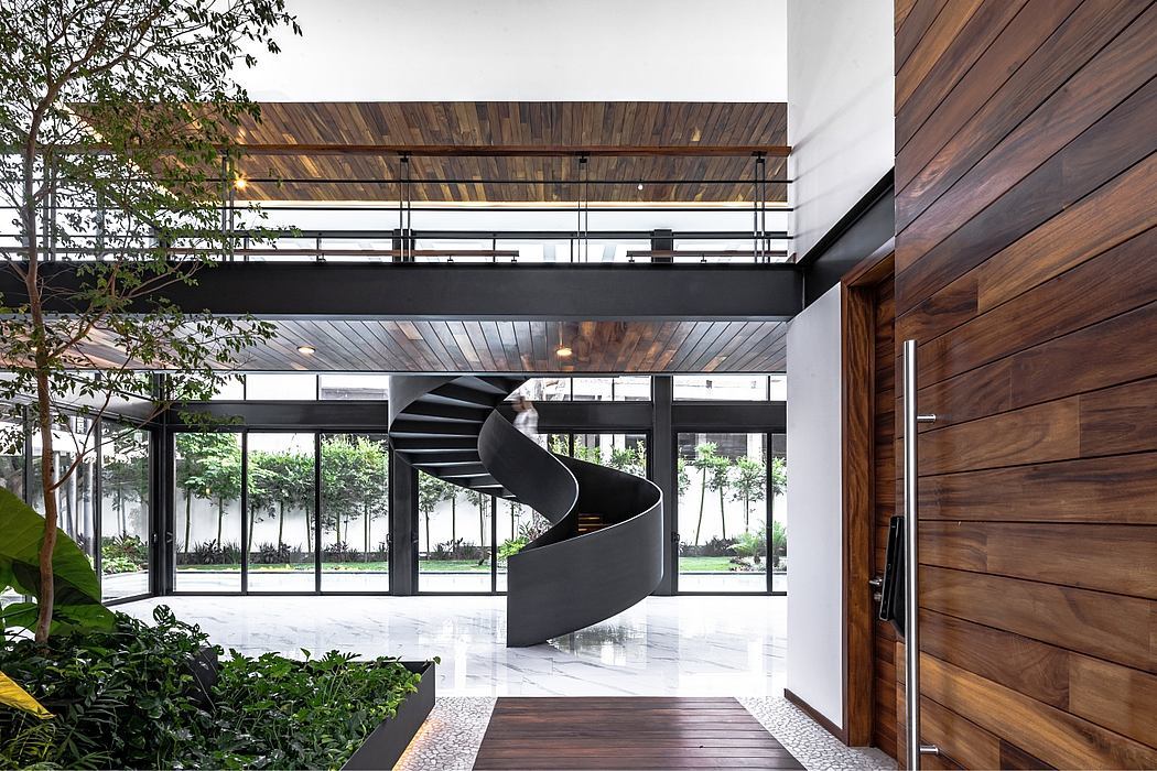氣勢(shì)磅礴的鐵匠螺旋樓梯是結(jié)構(gòu)解決方案的一個(gè)基本元素,并允許一個(gè)清晰的空間,在這個(gè)雕塑元素和建筑構(gòu)件之間產(chǎn)生對(duì)話,如鋼柱和梁,涂成黑色,最終融入了建筑的美學(xué)房子。喚醒溫暖的感覺(jué)是材料的任務(wù)。parota、Blanco Galarza 石頭和白色地板;覆蓋空間喚起熱帶氣候的情感。其他元素,如屏幕格子,保護(hù)用戶免受方向和太陽(yáng)的影響,在房子的表面產(chǎn)生在某些時(shí)間有節(jié)奏的光和影。