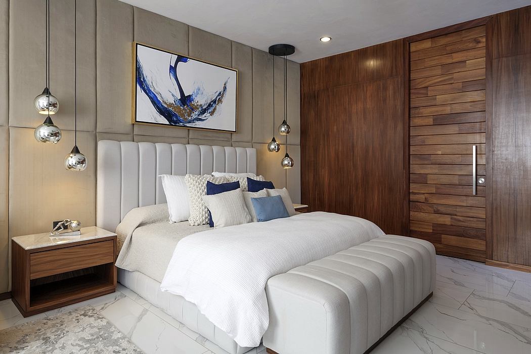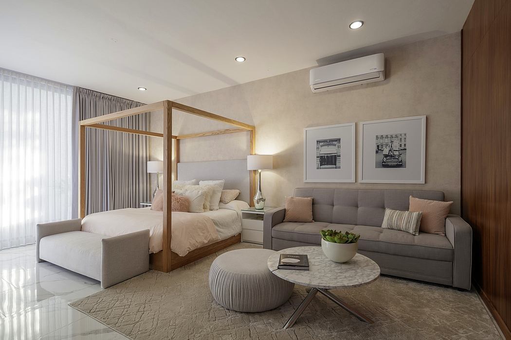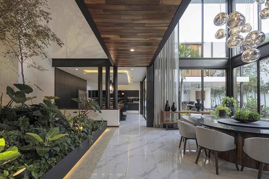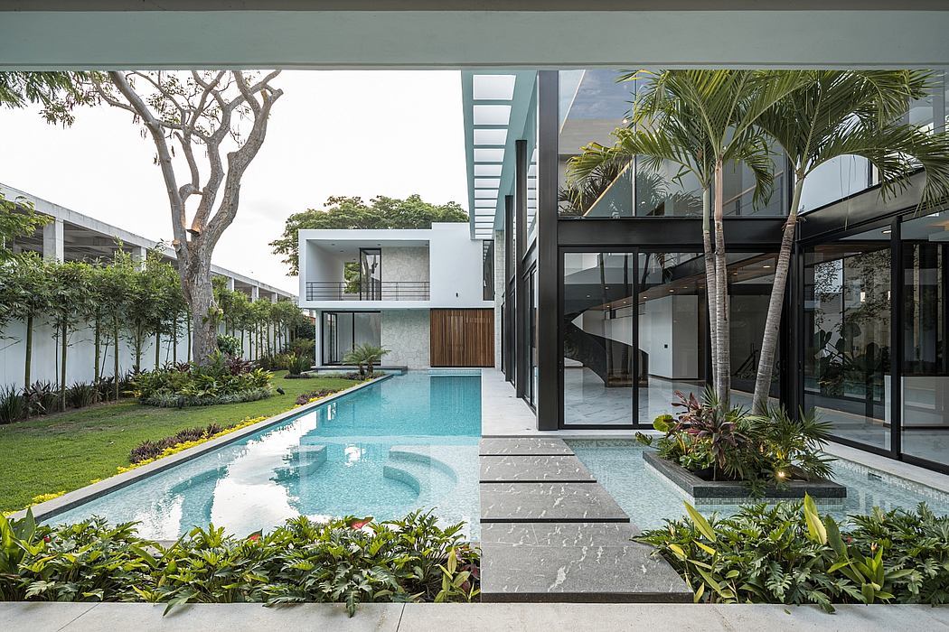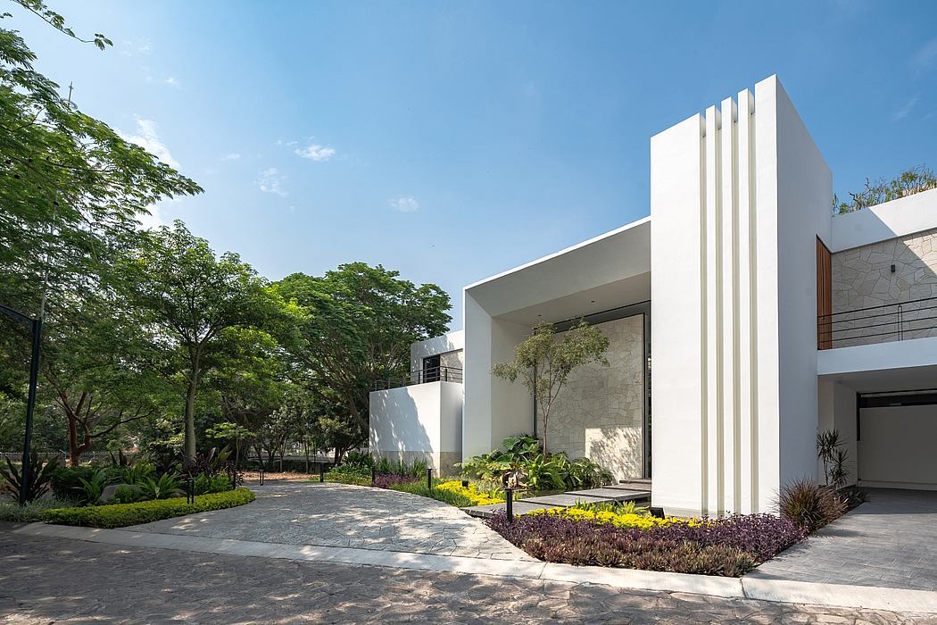 氣勢(shì)磅礴的鐵匠螺旋樓梯是結(jié)構(gòu)解決方案的一個(gè)基本元素,并允許一個(gè)清晰的空間,在這個(gè)雕塑元素和建筑構(gòu)件之間產(chǎn)生對(duì)話,如鋼柱和梁,涂成黑色,最終融入了建筑的美學(xué)房子。喚醒溫暖的感覺(jué)是材料的任務(wù)。parota、Blanco Galarza 石頭和白色地板;覆蓋空間喚起熱帶氣候的情感。其他元素,如屏幕格子,保護(hù)用戶免受方向和太陽(yáng)的影響,在房子的表面產(chǎn)生在某些時(shí)間有節(jié)奏的光和影。