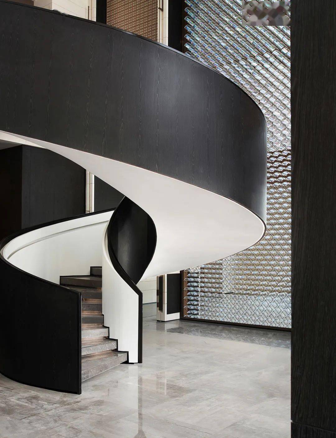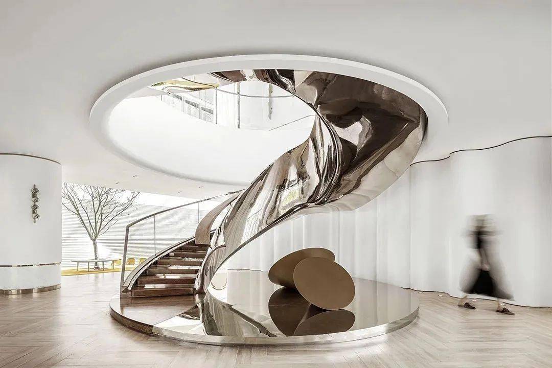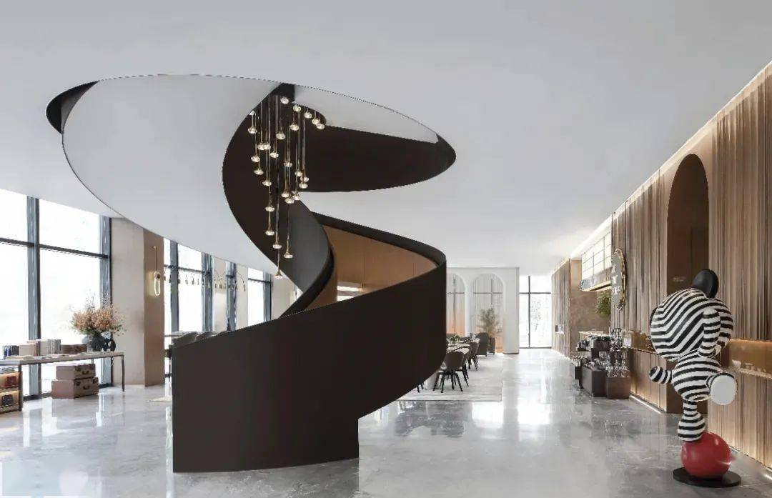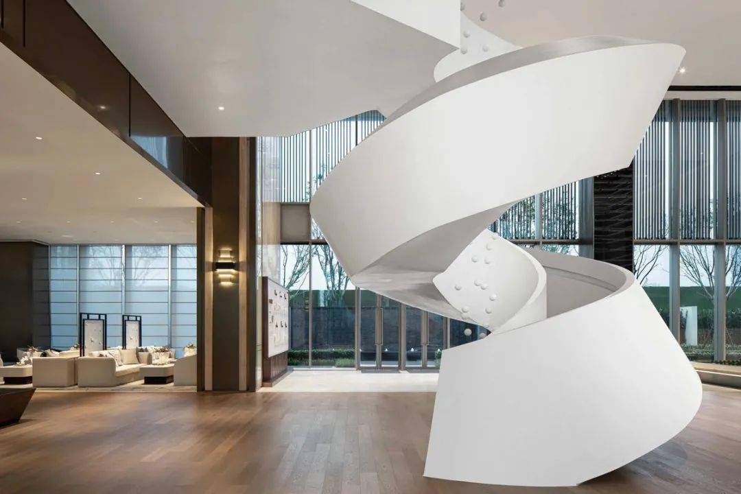 藝術(shù)的美感體現(xiàn)在整體造型和內(nèi)部細節(jié),樓梯作為售樓處設(shè)計中必不可少的大體量裝置,從建筑學(xué)與美學(xué)的角度來看,樓梯同時是上下兩個空間的焦點,也是設(shè)計師最值得發(fā)揮想象的地方。在樓梯的設(shè)計中也經(jīng)常會與藝術(shù)裝置、藝術(shù)吊燈相結(jié)合,打造一處既保留功能性,又充滿觀賞性的樓梯空間。