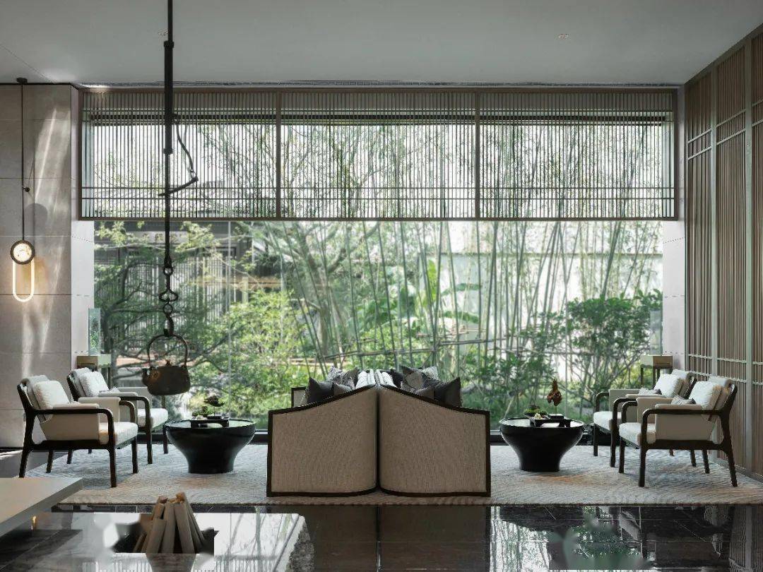 售樓處的設(shè)計往往是五位一體:建筑、景觀、環(huán)境、人文,室內(nèi),讓顧客從進入售樓處到離開,能體驗到合而為一的感受:借助室內(nèi)思維讓建筑及景觀的相互因借,滲透,以當代藝術(shù)手法再現(xiàn)東方意境,而大面積無敵落地窗是這一理念的重要載體。
