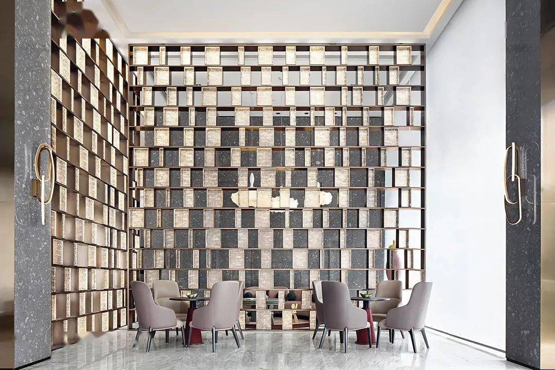 高隔斷,在售樓處等大型項目中起到非常重要的裝飾及功能作用,是一種通頂?shù)模瑒澐挚臻g的隔斷形式。高隔斷在分隔空間的同時又不阻斷視線,形成良好的視覺效果。在售樓處的設(shè)計中,高隔斷的樣式靈活多變,不論是玻璃隔斷、面板隔斷還是裝飾柜體作為隔斷,都能給空間帶來非常好的設(shè)計效果。